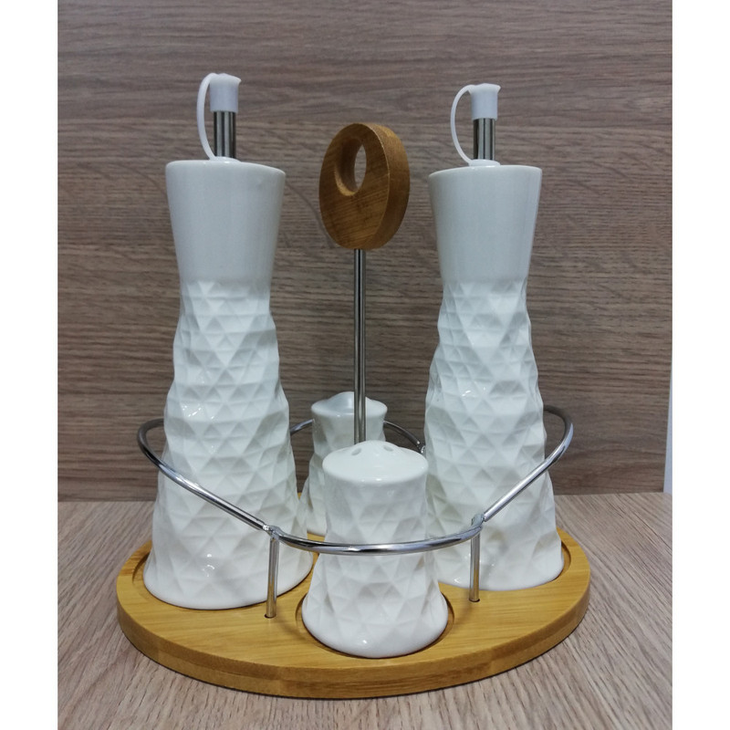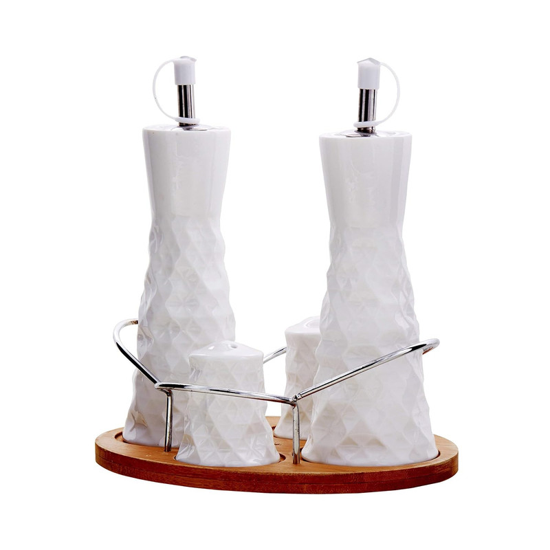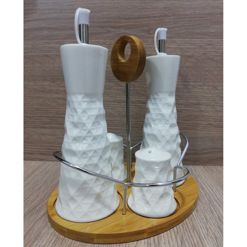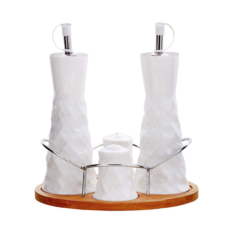 اقلام همراه : The set includes - 1 Table Tray:19.5x15.5x1 , 2 Oil & Vinegar Bottles:6.7x6.7x16.5, 2 Salt Pepper Shakers:5.2x5.2x5.5 - White Ceramic & Wood