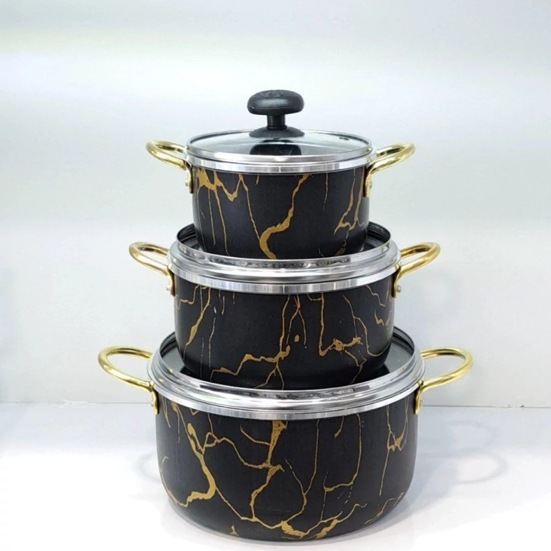 سرویس قابلمه ۷پارچه داخل گرانیت طرح سنگ دسته طلایی نسوز ۳عدد قابلمه و یک تابه بزرگ