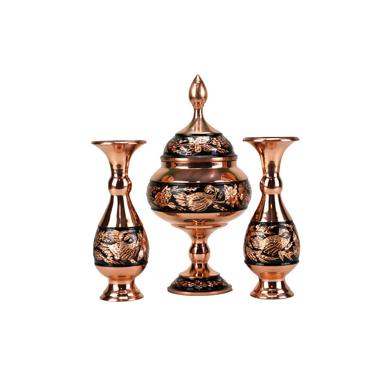 ست 3 تکه شکلات خوری و گلدان مسی مدل گل و مرغ کد 1231