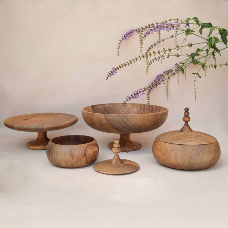 سرویس پذیرایی ساخته شده با چوب درخت گردو و روغنکاری شده با روغن مخصوص. این سرویس پذیرایی شامل شیرینی خوری، شکلات خوری، آجیل خوری و میوه خوری پایهدار بوده و به علت استفاده از رنگ خوراکی برای پوشش سطح آن، هیج آسیبی از نظر استعمال مواد خوراکی در آن ندارد. سایز هر یک از محصولات موجود در این سرویس به شرح زیر می باشد :