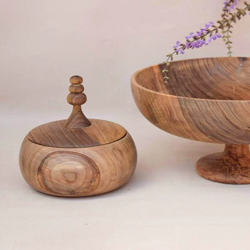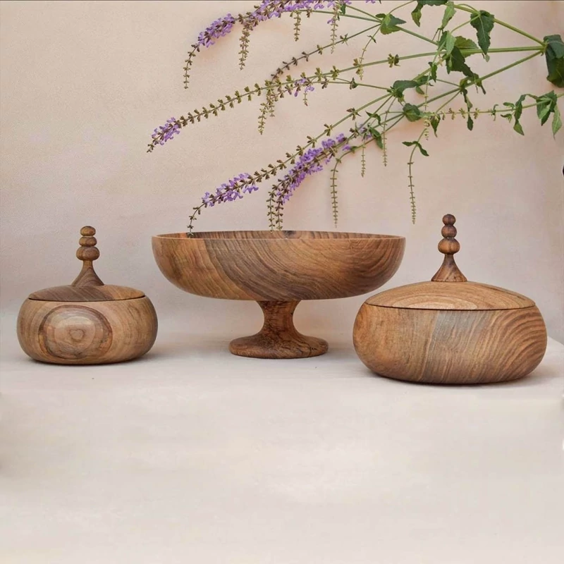 سرویس پذیرایی ساخته شده با چوب درخت گردو و روغنکاری شده با روغن مخصوص. این سرویس پذیرایی شامل شیرینی خوری، شکلات خوری، آجیل خوری و میوه خوری پایهدار بوده و به علت استفاده از رنگ خوراکی برای پوشش سطح آن، هیج آسیبی از نظر استعمال مواد خوراکی در آن ندارد. سایز هر یک از محصولات موجود در این سرویس به شرح زیر می باشد :
