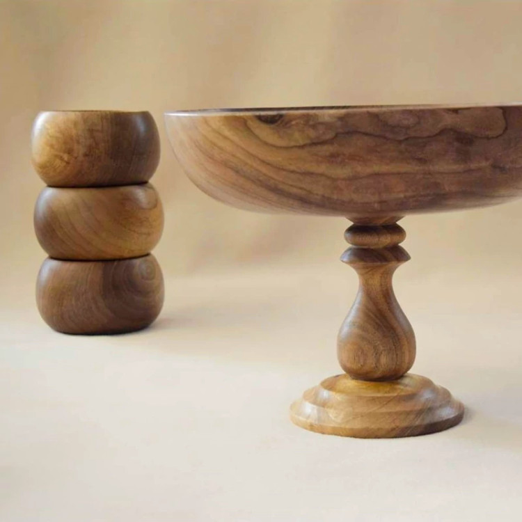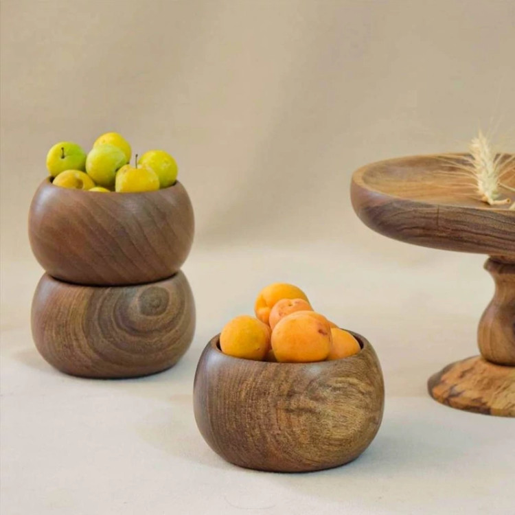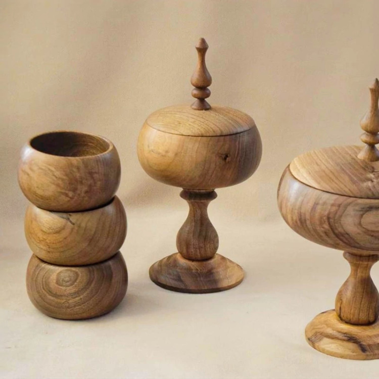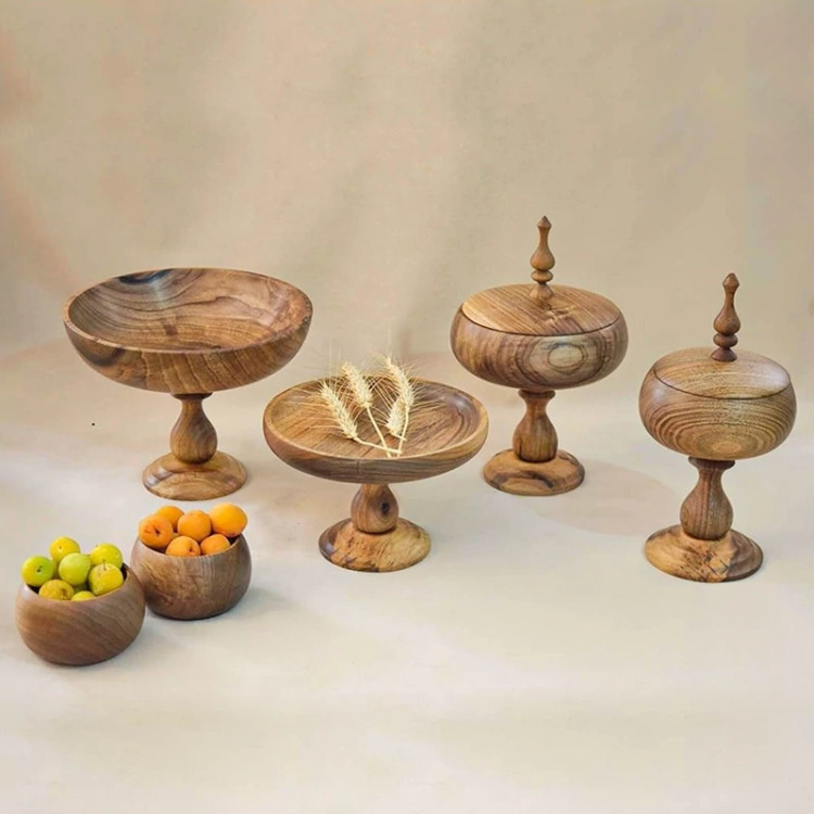 سرویس پذیرایی ساخته شده با چوب درخت گردو و روغنکاری شده با روغن مخصوص. این سرویس پذیرایی زیبا شامل شیرینی خوری، شکلات خوری، آجیل خوری، میوه خوری پایهدار و سه عدد کاسه خمرهای بوده و به علت استفاده از رنگ خوراکی برای پوشش سطح آن، هیج آسیبی از نظر استعمال مواد خوراکی در آن ندارد. سایز هر یک از محصولات موجود در این سرویس به شرح زیر می باشد :