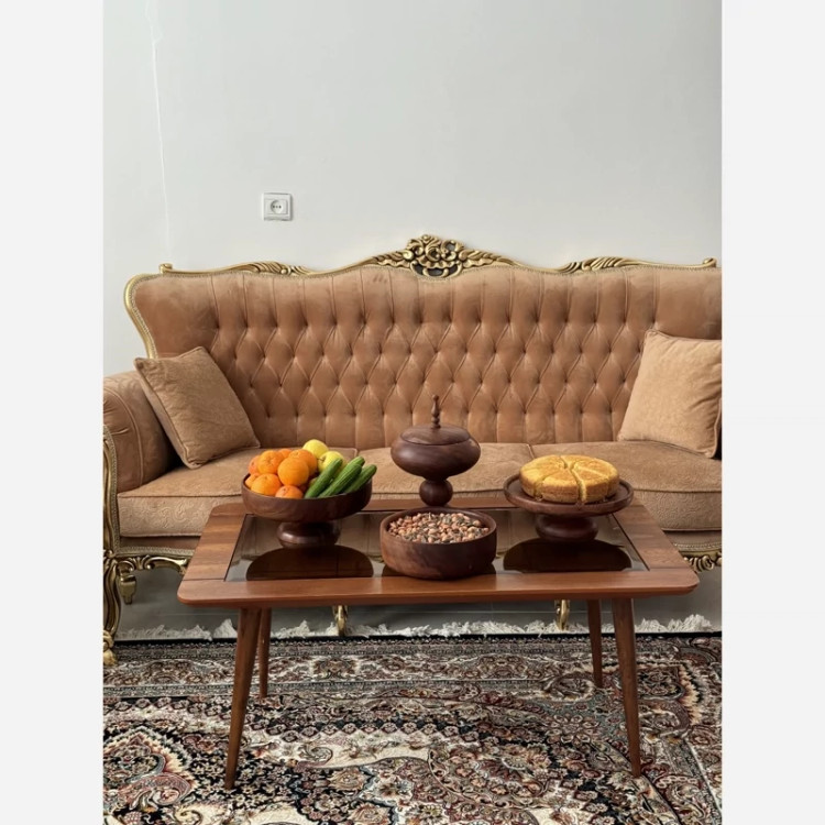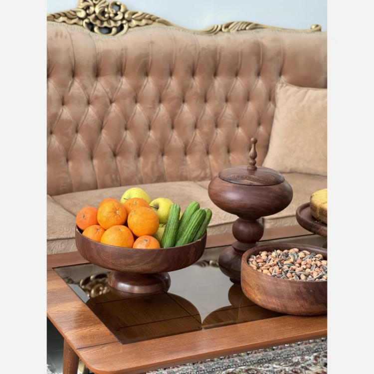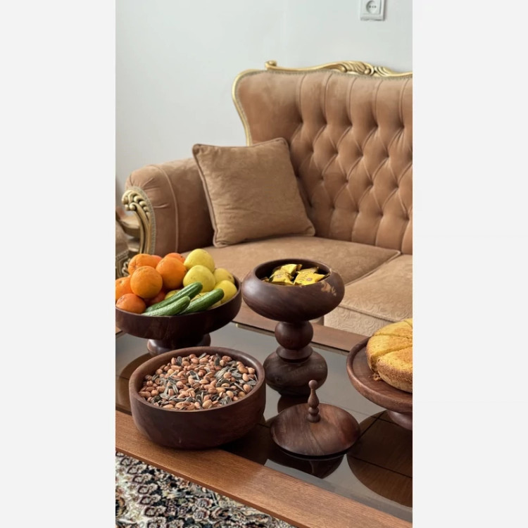 سرویس پذیرایی ساخته شده با چوب درخت گردو و روغنکاری شده با روغن مخصوص. این سرویس پذیرایی شامل شیرینی خوری، شکلات خوری، آجیل خوری و میوه خوری پایهدار بوده و به علت استفاده از رنگ خوراکی برای پوشش سطح آن، هیج آسیبی از نظر استعمال مواد خوراکی در آن ندارد. سایز هر یک از محصولات موجود در این سرویس به شرح زیر می باشد :