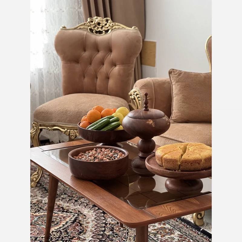 سرویس پذیرایی ساخته شده با چوب درخت گردو و روغنکاری شده با روغن مخصوص. این سرویس پذیرایی شامل شیرینی خوری، شکلات خوری، آجیل خوری و میوه خوری پایهدار بوده و به علت استفاده از رنگ خوراکی برای پوشش سطح آن، هیج آسیبی از نظر استعمال مواد خوراکی در آن ندارد. سایز هر یک از محصولات موجود در این سرویس به شرح زیر می باشد :