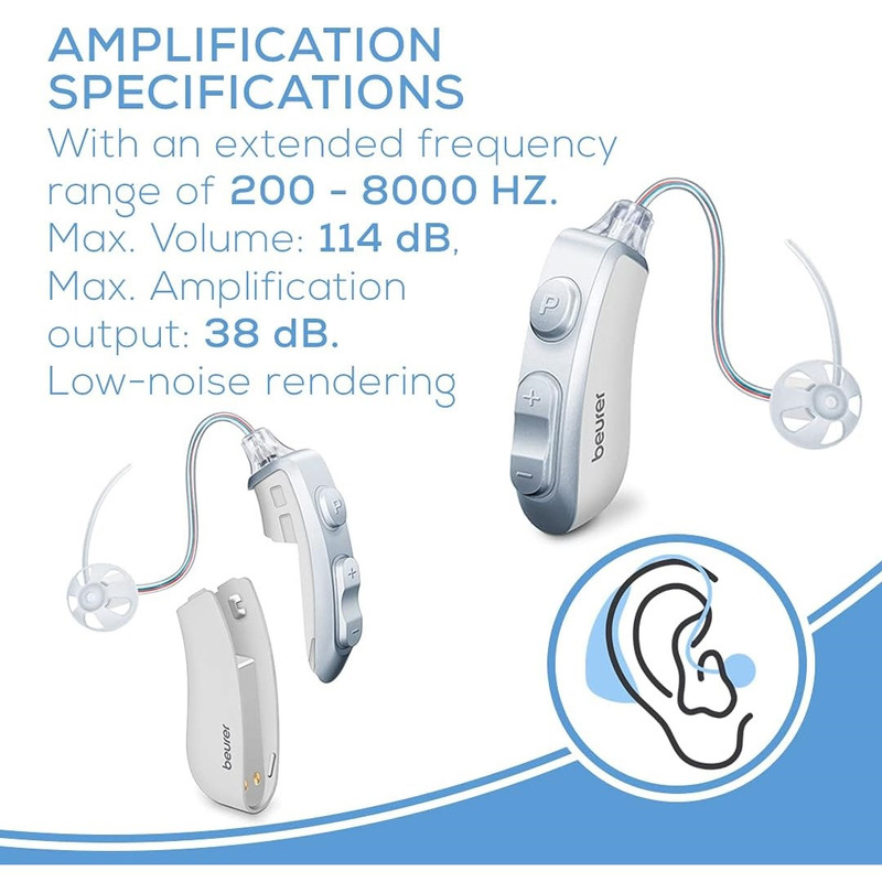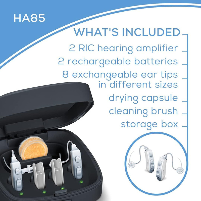 اقلام همراه: (2) تقویت کننده های شنوایی دیجیتال، (8) گوش قابل تعویض در اندازه های مختلف، (2) باتری های قابل شارژ یدکی، (1) برس تمیز کننده، (1) کپسول خشک کن، (1) جعبه ذخیره سازی، (1) راهنمای دستورالعمل