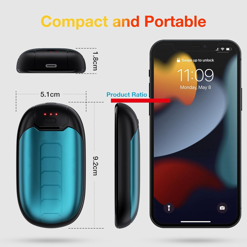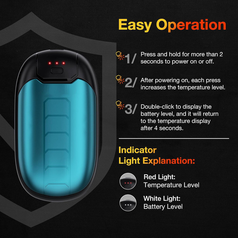 امنیت ارتقا یافته: مدار بهینه شده و بهبود یافته طول عمر و محافظت در برابر تخلیه بیش از حد، شارژ بیش از حد، گرمای بیش از حد و اتصال کوتاه را تضمین می کند. با دست گرم کن ارگونومیک می توانید به راحتی و راحت آن را از جیب خود بیرون بیاورید! اگر محصول برای مدت طولانی استفاده نمی شود، برای اطمینان از عملکرد باتری و جلوگیری از آسیب به محصول، باید هر 3 ماه یکبار شارژ شود.