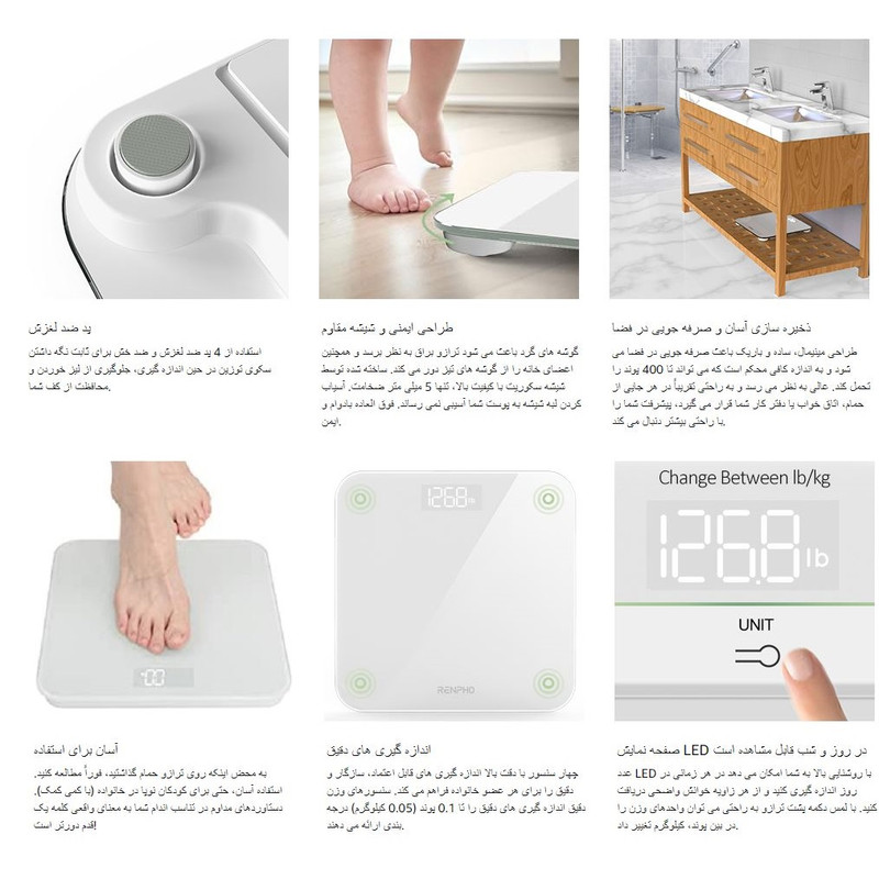 پلت فرم: شیشه سکوریت چند منظوره: باتری کم / نشانگر اضافه بار. خودکار روشن/خاموش/صفر واحد: کیلوگرم بر پوند