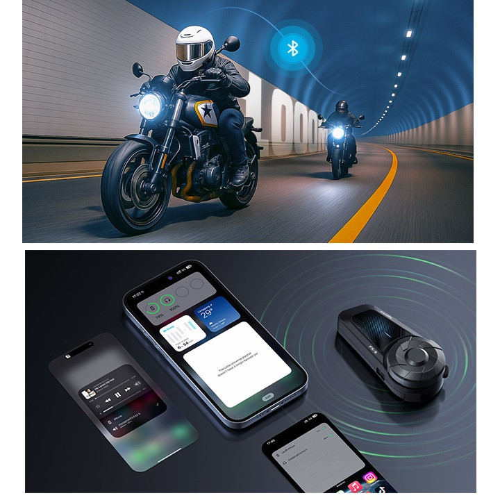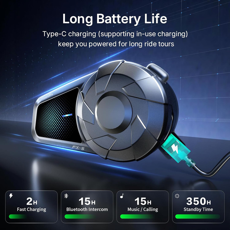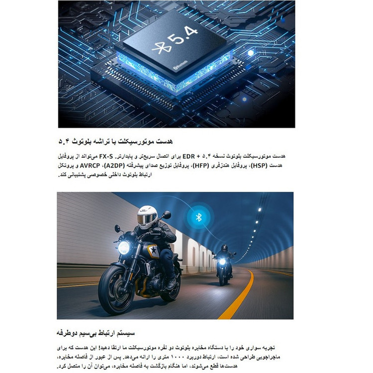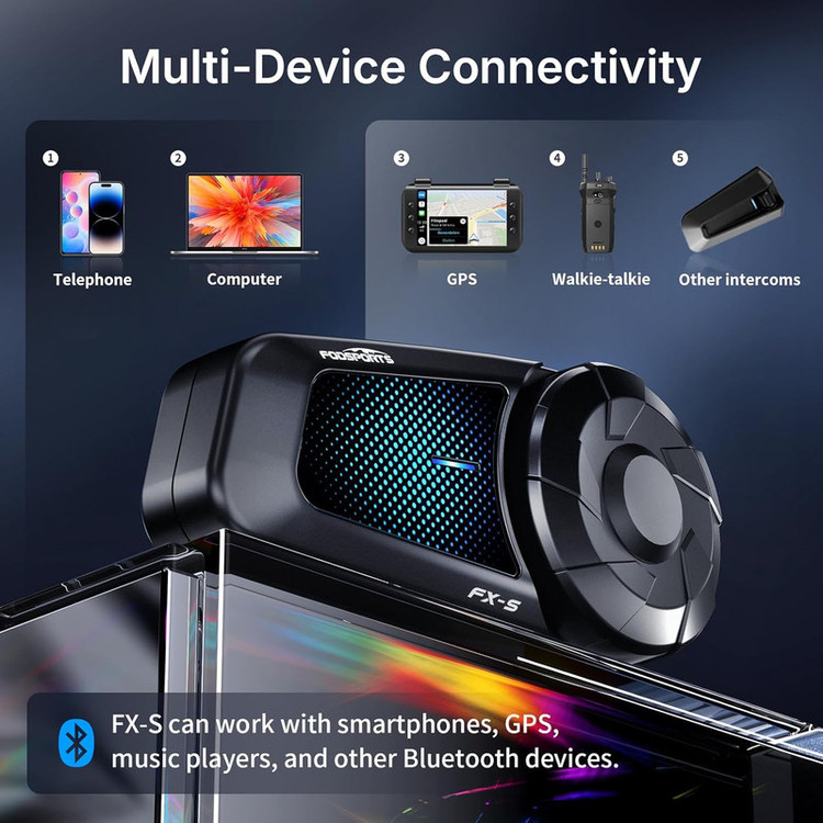 بلوتوث ۵.۴ و اتصال چند دستگاهی : با استفاده از جدیدترین تراشه کوالکام با فناوری بلوتوث ۵.۴، جفت شدن سریعتر، تأخیر بسیار کم و اتصال پایدار. هدست بلوتوث کلاه ایمنی FX-S میتواند با تلفنهای هوشمند، GPS، پخشکنندههای موسیقی و سایر هدستهای بلوتوث کار کند.