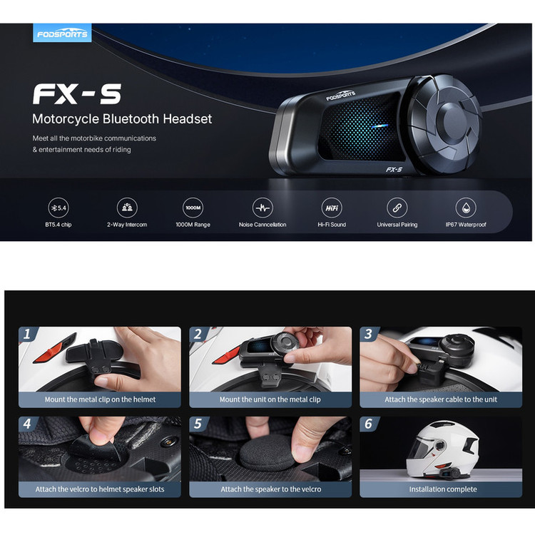 ارتباط بلوتوثی دو موتورسوار و برد ۱۰۰۰ متر : هدست Fodsports FX-S یک هدست ارتباط داخلی موتورسواری دو موتورسوار است که از چتهای داخلی یکپارچه با دوست یا همسفر خود تا برد ۱۰۰۰ متر لذت ببرید. میتوانید در زمینهای باز به راحتی با شریک موتورسواری خود در ارتباط باشید.