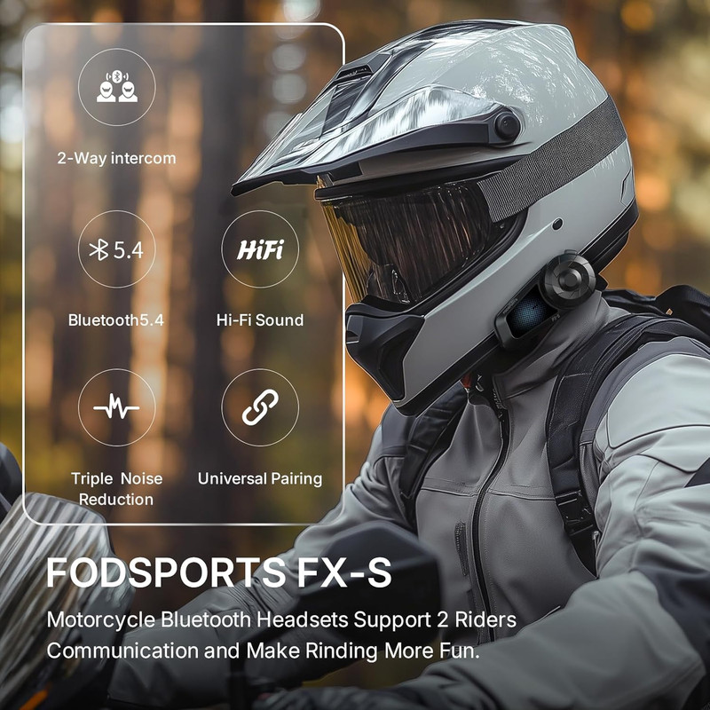ارتباط بلوتوثی دو موتورسوار و برد ۱۰۰۰ متر : هدست Fodsports FX-S یک هدست ارتباط داخلی موتورسواری دو موتورسوار است که از چتهای داخلی یکپارچه با دوست یا همسفر خود تا برد ۱۰۰۰ متر لذت ببرید. میتوانید در زمینهای باز به راحتی با شریک موتورسواری خود در ارتباط باشید.