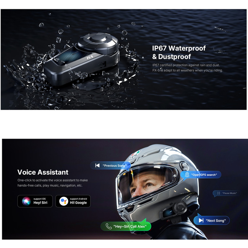 بلوتوث ۵.۴ و اتصال چند دستگاهی : با استفاده از جدیدترین تراشه کوالکام با فناوری بلوتوث ۵.۴، جفت شدن سریعتر، تأخیر بسیار کم و اتصال پایدار. هدست بلوتوث کلاه ایمنی FX-S میتواند با تلفنهای هوشمند، GPS، پخشکنندههای موسیقی و سایر هدستهای بلوتوث کار کند.
