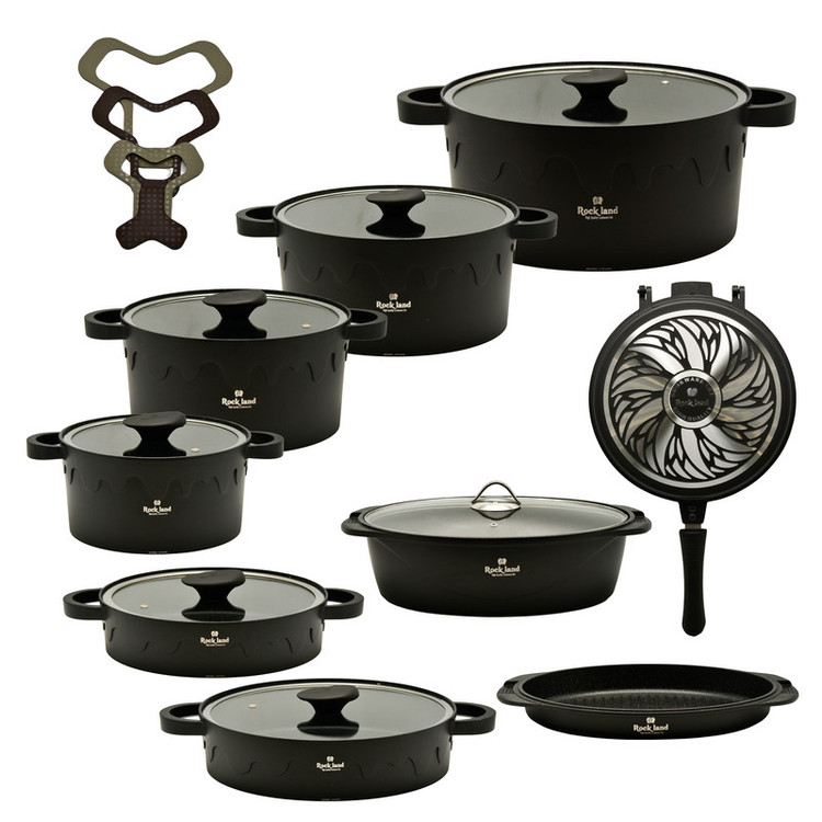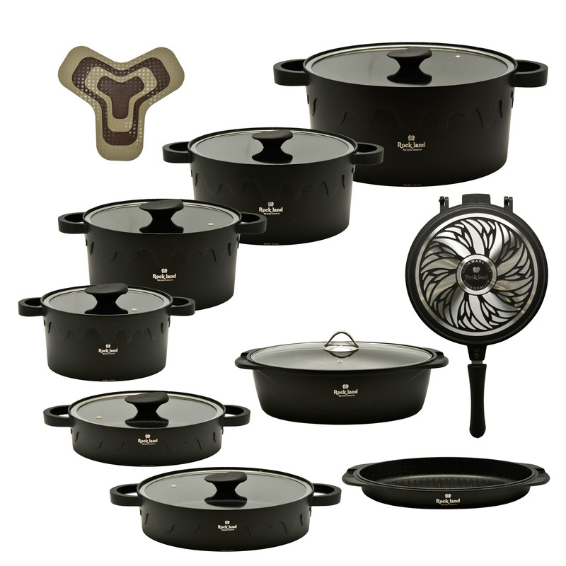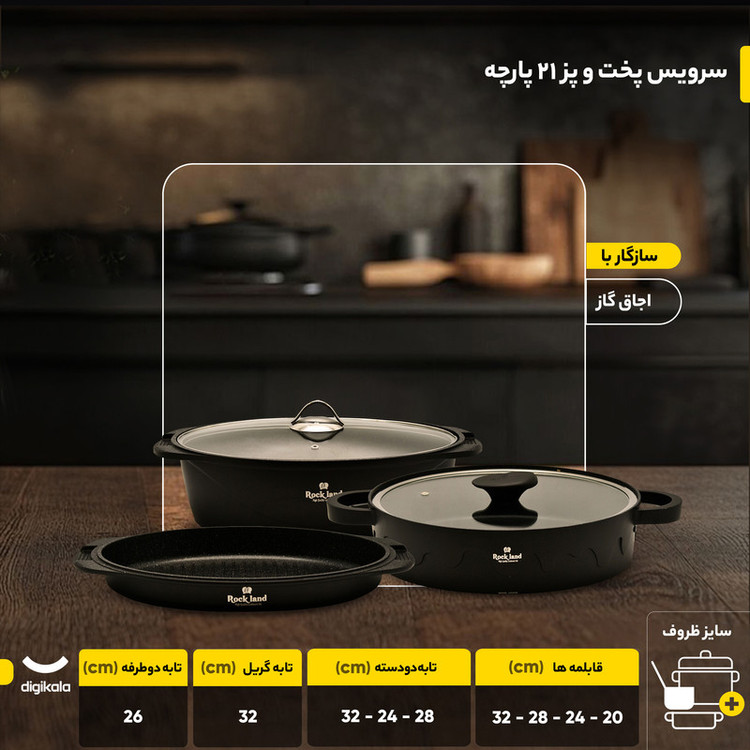 سرویس پخت و پز 21 پارچه راکلند یک مجموعه کامل و جامع است که با تنوع بینظیر ظروف، تمام نیازهای یک آشپزخانه حرفهای و خانگی را برآورده میکند. این سرویس که ساخت کشور ایران است، شامل چهار قابلمه در سایزهای مختلف، چندین تابه دو دسته، یک تابه دوطرفه رژیمی و یک تابه گریل است. اقلام کاربردی دیگری مانند زیرقابلمهای نیز در این مجموعه ۲۱ پارچه گنجانده شده است.