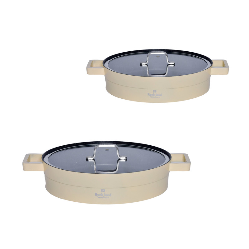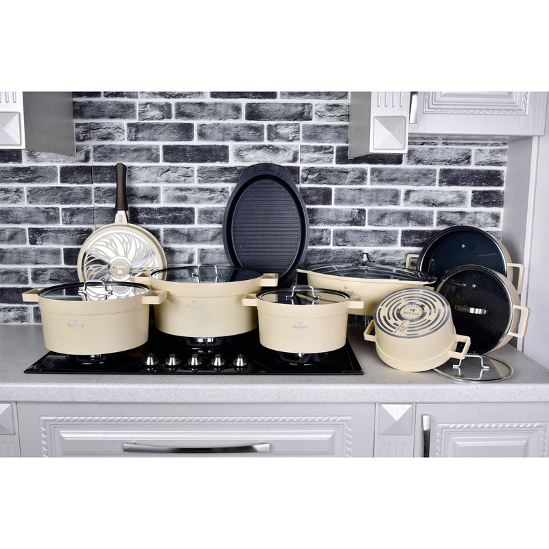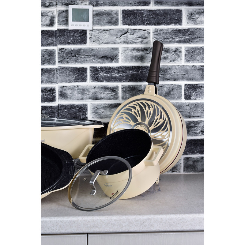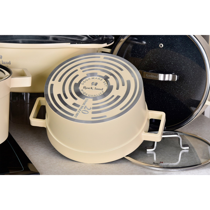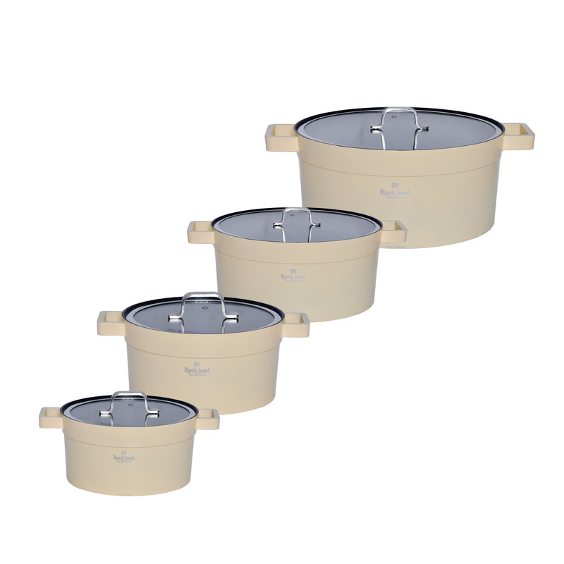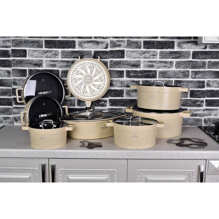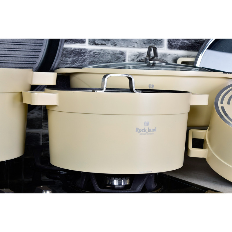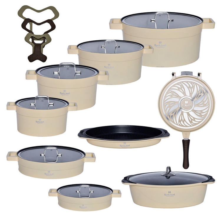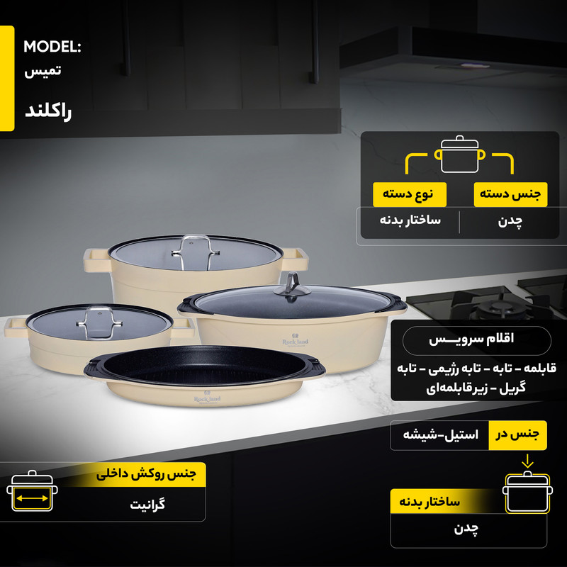 سرویس پختوپز ۲۱ پارچه راکلند مدل تمیس انتخابی کامل برای خانواده است. این مجموعه شامل چهار قابلمه با قطرهای ۲۰، ۲۴، ۲۸ و ۳۲ سانتیمتر به همراه درب شیشهای مقاوم به حرارت، دو عدد تابه دودسته در سایزهای ۲۴ و ۲۸، یک عدد تابه رژیمی گرد و یک عدد تابه بیضی مخصوص پخت مرغ یا ماهی است. همچنین در کنار این ظروف اصلی، زیرقابلمهای نیز قرار گرفته است.
