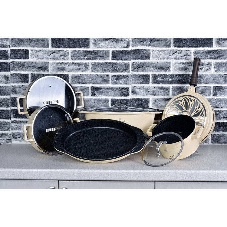 این سرویس با اجاق گاز، المنت برقی و اجاق سرامیکی سازگاری دارد. ظاهر مینیمال، پوشش مات و کیفیت ساخت بالا، اون رو به گزینهای مناسب برای جهیزیه و آشپزهای خوشسلیقه تبدیل کرده است.