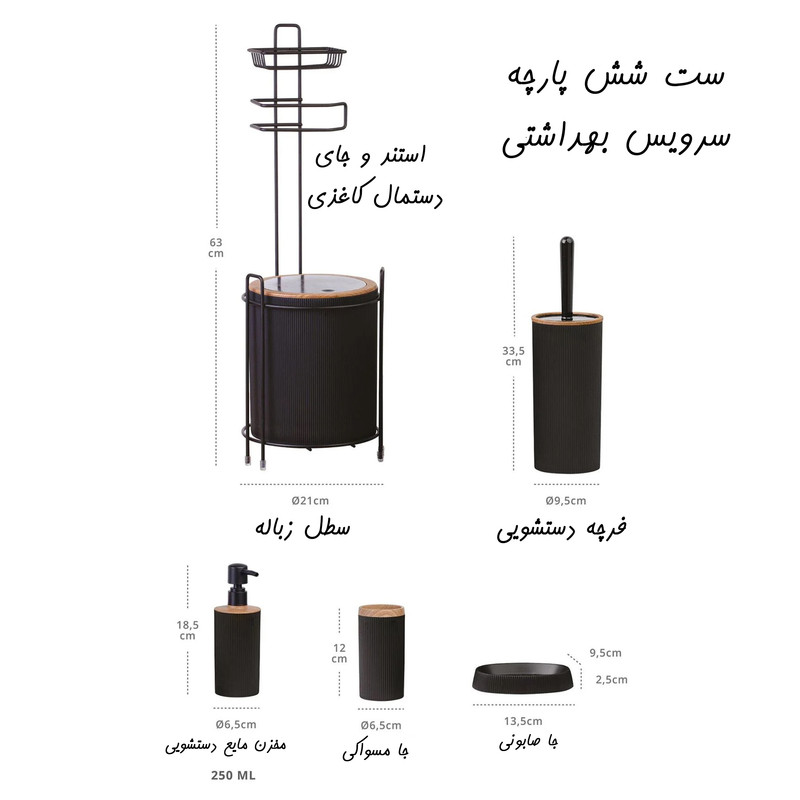 استند جا دستمالی : 63x21 فرچه دستشویی : 9.5x35.5 جا مسواکی : 6.5x12 جاصابونی : 9.5x2.5x13.5 مخزن مایع دستشویی : 6.5x18.5