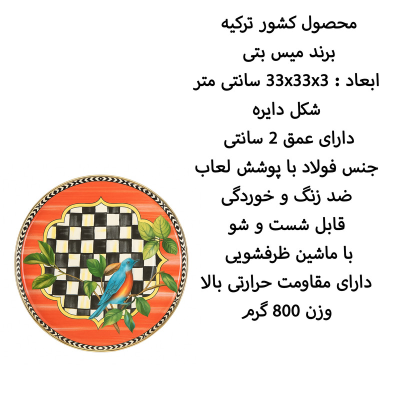 محصول کشور ترکیه - برند میس بتی - ابعاد : 33x33x3 سانتی متر - شکل دایره - دارای عمق 2 سانتی - جنس فولاد با پوشش لعاب - ضد زنگ و خوردگی - قابل شست و شو با ماشین ظرفشویی - دارای مقاومت حرارتی بالا - وزن 800 گرم