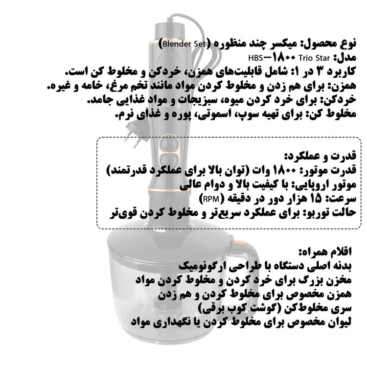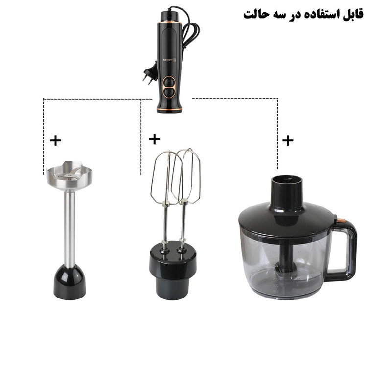 اقلام همراه: بدنه اصلی دستگاه با طراحی ارگونومیک مخزن بزرگ برای خرد کردن و مخلوط کردن مواد همزن مخصوص برای مخلوط کردن و هم زدن سری مخلوطکن (گوشت کوب برقی) لیوان مخصوص برای مخلوط کردن یا نگهداری مواد