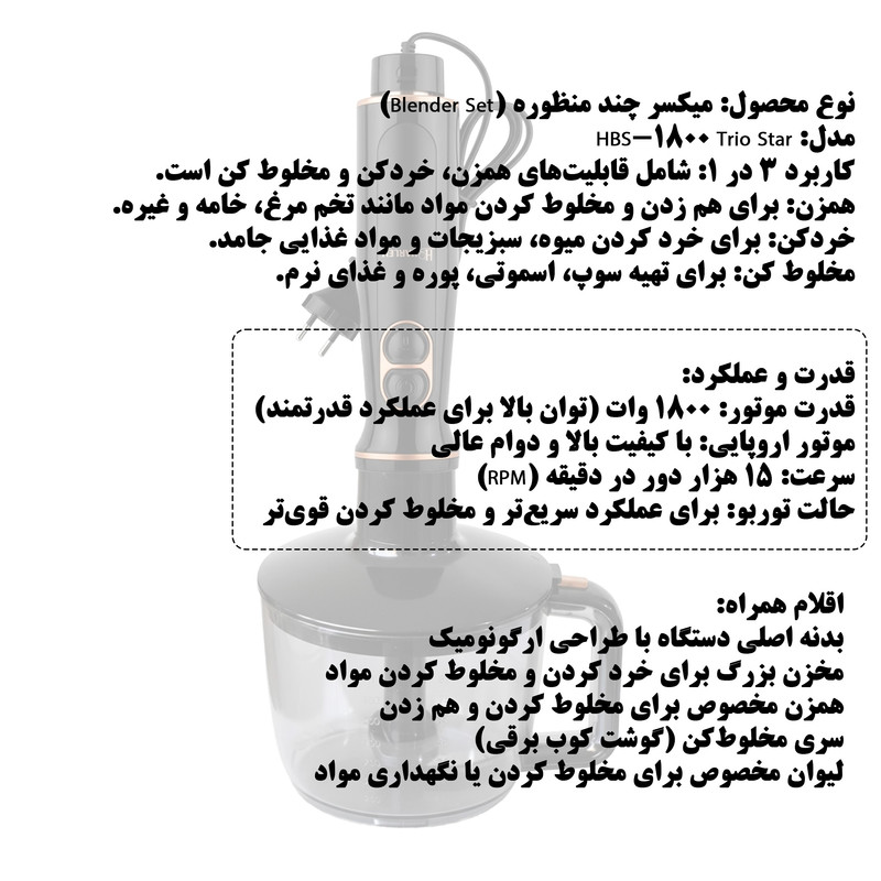 اقلام همراه: بدنه اصلی دستگاه با طراحی ارگونومیک مخزن بزرگ برای خرد کردن و مخلوط کردن مواد همزن مخصوص برای مخلوط کردن و هم زدن سری مخلوطکن (گوشت کوب برقی) لیوان مخصوص برای مخلوط کردن یا نگهداری مواد