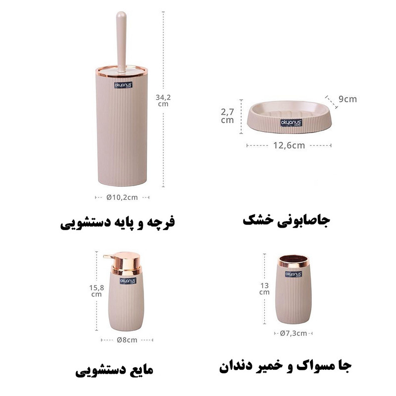 فرچه : ۱۰x۱۰x۳۴ - جا مسواکی : ۷x۷x13 - ظرف مایع دستشویی : 15*8*8- جا صابونی : 3X8X12جافرچه: 10X10X22