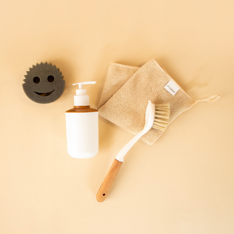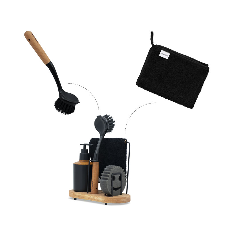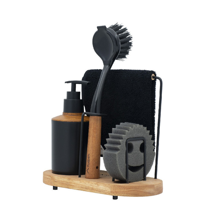 مخزن مایع ظرفشویی کلبه مدل استند دار به همراه فرچه، اسکاچ و دستمال نظافت