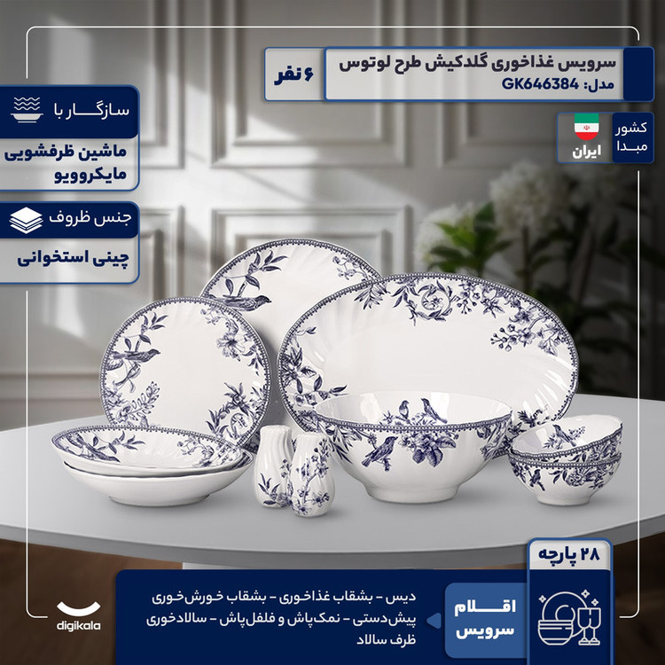 سرویس غذاخوری 28 پارچه 6 نفر گلد کیش مدل GK646384 طرح لوتوس