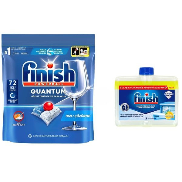 قرص ماشین ظرفشویی فینیش مدل Quantum Hepsi 1 Arada بسته 72 عددی به همراه جرمگیر ظرفشویی فینیش مدل لیمو حجم 250 میلی مجموعه 2 عددی
