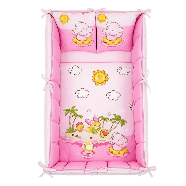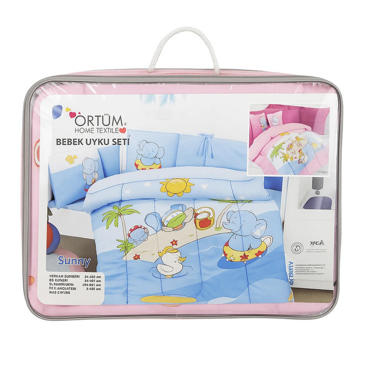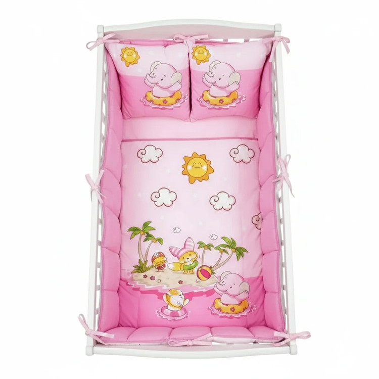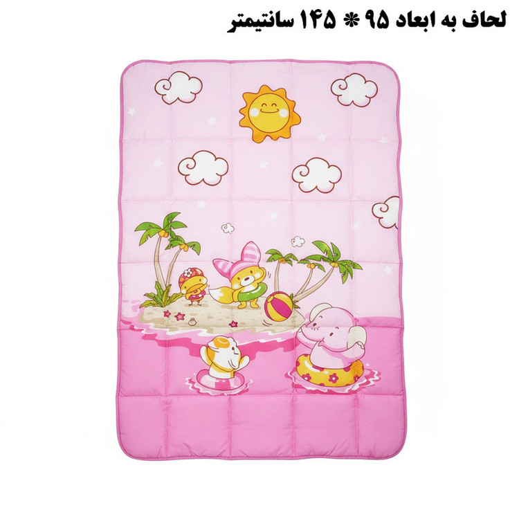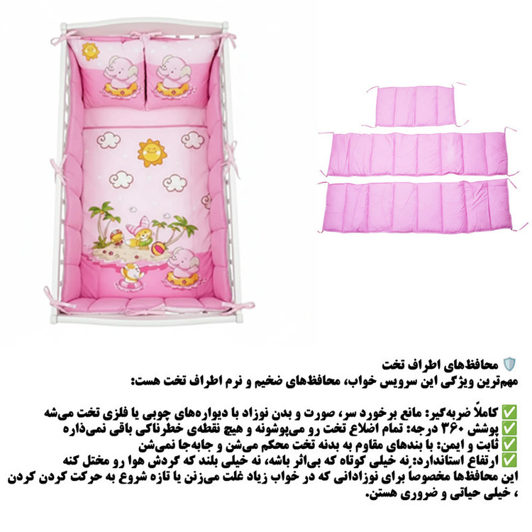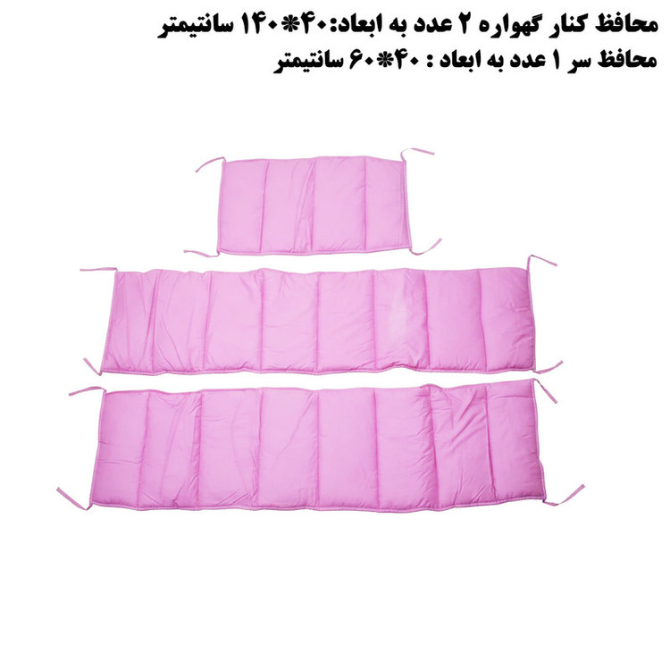 2 عدد رو بالشی 35*45 سانتیمتر 1 عدد لحاف 95*145 سانتی متر 2 عدد محافظ گهواره 40*140 سانتی متر 1 عدد محافظ سر 40*60 سانتیمتر 1 عدد محافظ لحاف 95*170 سانتی متر 1عدد رو کش تشک 100*150 سانتی متر