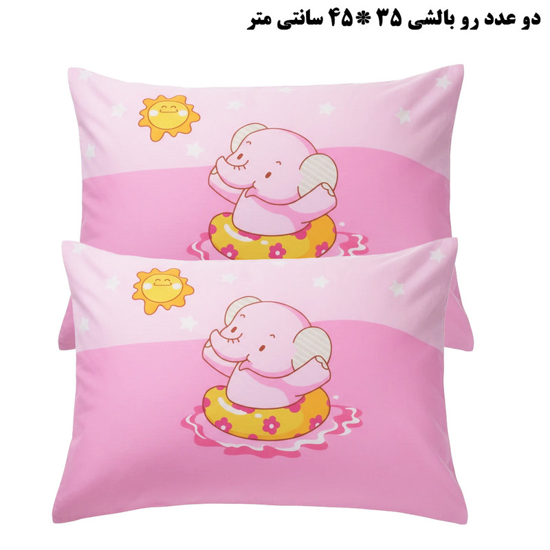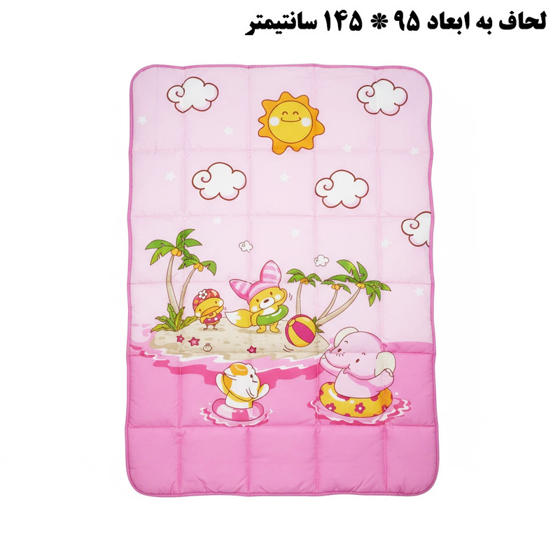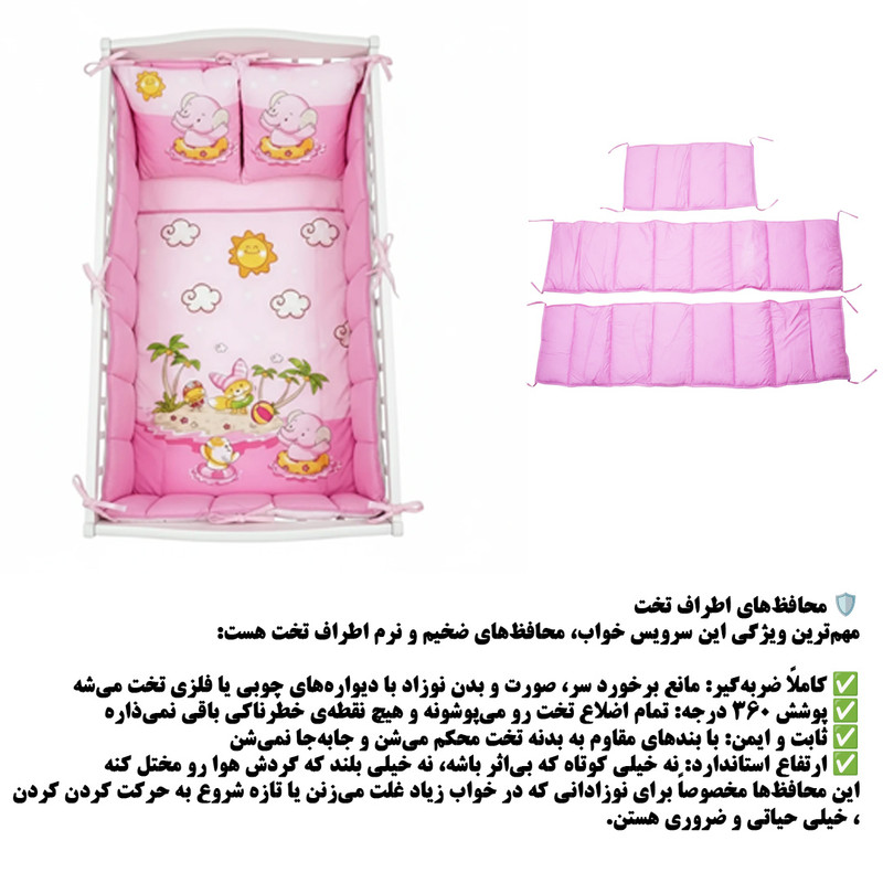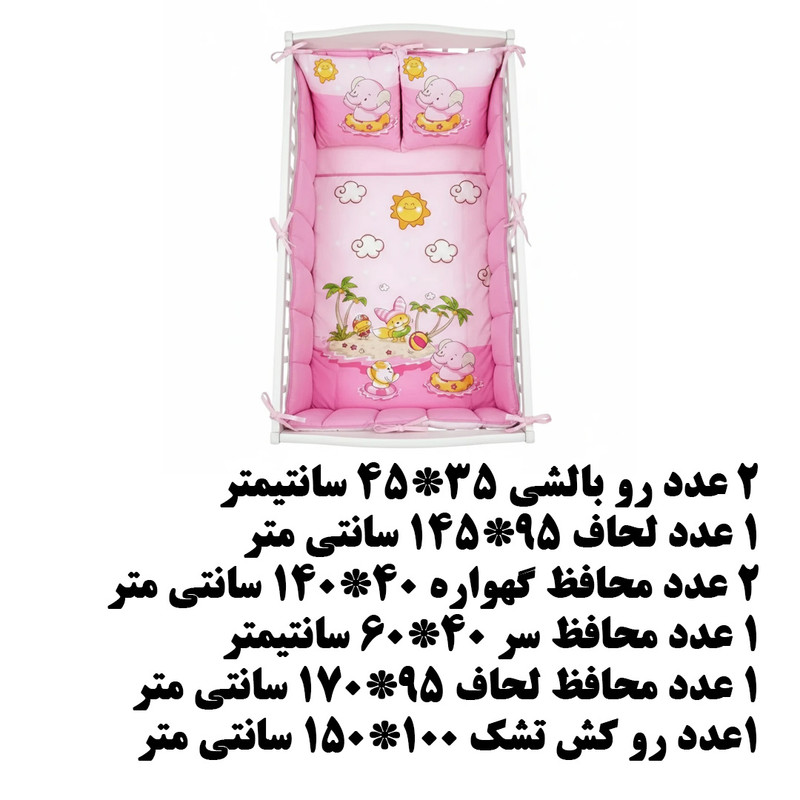 2 عدد رو بالشی 35*45 سانتیمتر 1 عدد لحاف 95*145 سانتی متر 2 عدد محافظ گهواره 40*140 سانتی متر 1 عدد محافظ سر 40*60 سانتیمتر 1 عدد محافظ لحاف 95*170 سانتی متر 1عدد رو کش تشک 100*150 سانتی متر
