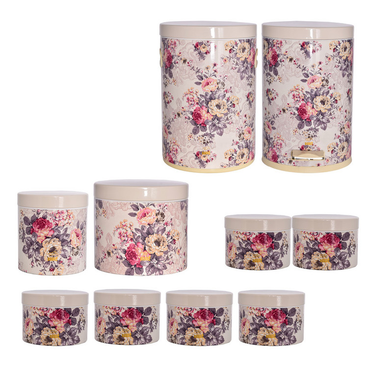 این ست شامل : 1 عدد سطل زباله ، 1 عدد سطل برنج ، 1 عدد سطل قند ، 1 عدد سطل شکر، 6 عدد جا حبوبات
