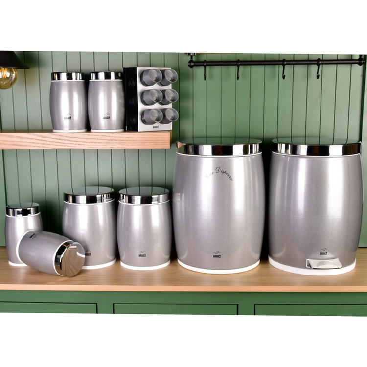 این ست شامل : 1 عدد سطل زباله ، 1 عدد سطل برنج ، 1 عدد سطل قند ، 1 عدد سطل شکر، 4 عدد جا حبوبات ، جا ادویه 6 پارچه همراه استند