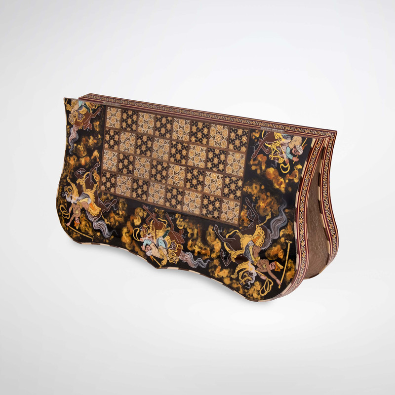 شطرنج خاتمکاری با نقاشیهای هنرمندانه شکار، اثری نفیس و ارزشمند از هنر اصیل ایرانی است که با دستان هنرمندان چیرهدست خلق شده است. این شطرنج زیبا، که در آن چوب، استخوان و فلز با نقشهای خاتم درهمتنیدهاند، جلوهای بیهمتا از هنر ایرانی را به نمایش میگذارد. نقشهای هندسی و هماهنگ خانههای شطرنج، با رنگهای گرم و جذاب، همراه با نقاشیهای ظریف شکار، زیبایی و اصالت این اثر را دوچندان کرده و هر نگاه را مجذوب خود میسازد.