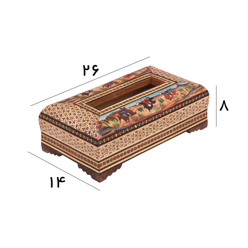 بدنه این جعبه از چوب طبیعی ساخته شده و سطح آن با خاتمکاری معمولی پوشانده شده است. بخش مرکزی درب به نقاشی سنتی شکار اختصاص یافته؛ تصویری از سوارکاران و طبیعت، که روایتگر صحنهای از زندگی گذشته ایرانیان است. درب پایینی بهصورت کشویی طراحی شده و پایههای زیرین با طراحی سنتی، ایستایی و استحکام مناسبی فراهم کردهاند.