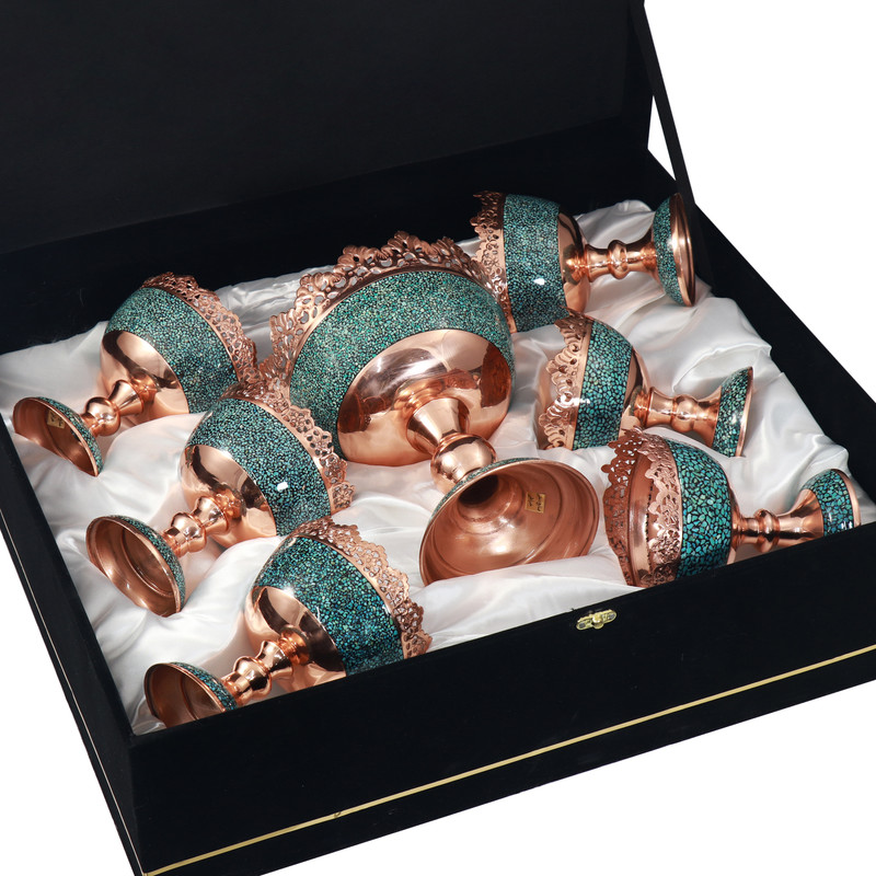 محتوای این مجموعه شامل یک عدد آجیلخوری فیروزهکوب سایز 5 به همراه شش عدد آجیلخوری فیروزهکوب سایز 3 است؛ تمامی قطعات با دقت بالا و توسط استادکاران مجرب این هنر چشمنواز تولید شدهاند و با درخشش سنگهای فیروزهی نیشابور، جلوهای بیبدیل به فضای پذیرایی میبخشند.