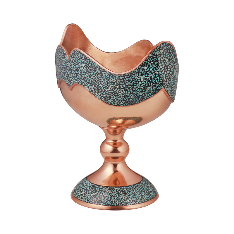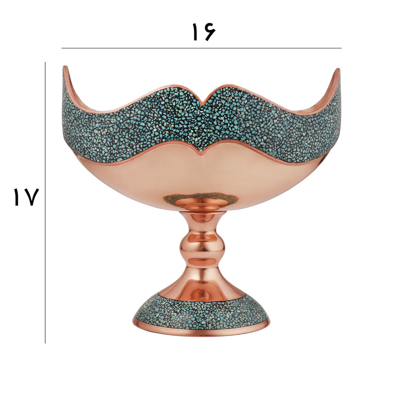 مشخصات فیزیکی: کشکول ۱۷ فیروزهکوب با ارتفاع ۱۷ سانتیمتر و قطر دهانه ۱۶ سانتیمتر ساخته شده از فلز مس و تزئینشده با قطعات فیروزه نیشابور است. سطح خارجی آن با پوشش پلیاستر شفاف جلا داده شده تا هم در برابر آسیب محافظت شود و هم جلوه درخشانی پیدا کند. طراحی متقارن، پایهدار و منحنی این کشکول جلوهای فاخر و کاربردی به آن بخشیده است. این محصول با پوشش محافظ شفاف که شامل چهار لایه پلی استر است ماندگاری بالایی پیدا کرده است.