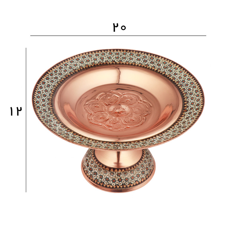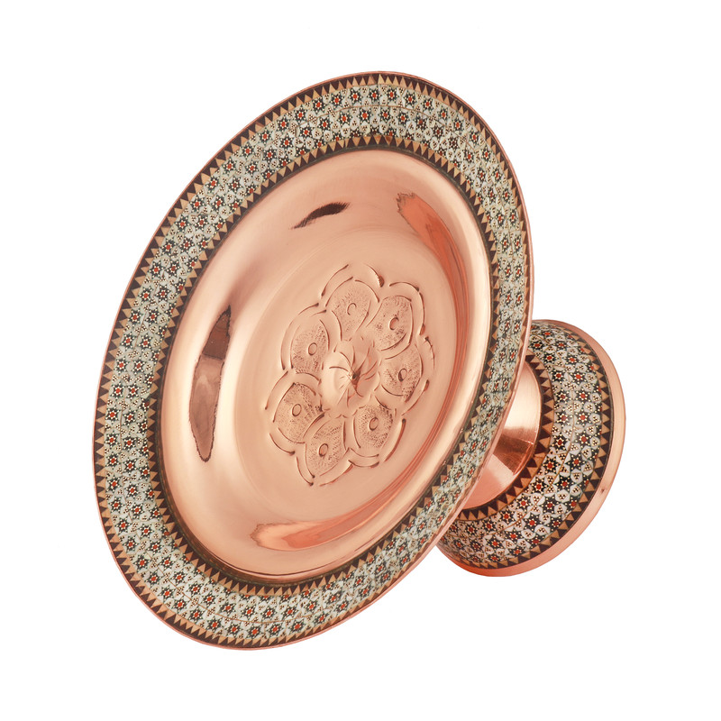 نوع هنر: خاتمکاری یکی از هنرهای اصیل ایرانی است که با ترکیب قطعات بسیار کوچک چوب، فلز و استخوان در کنار هم، نقشهای هندسی زیبا و منظم ایجاد میکند. در این شیرینی خوری، خاتم ۲۴ سیم فیروزه ۲-۲۰ با دقت و ظرافت روی بدنه مسی پیاده شده و سپس با پوشش محافظ شفاف، ماندگاری و درخشندگی آن را بسیار بالا میبرد.
