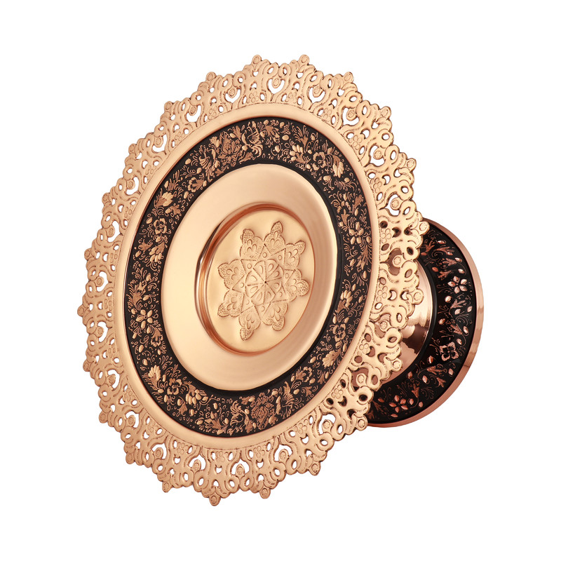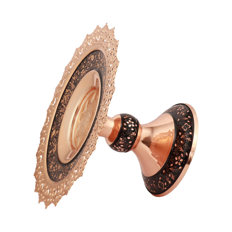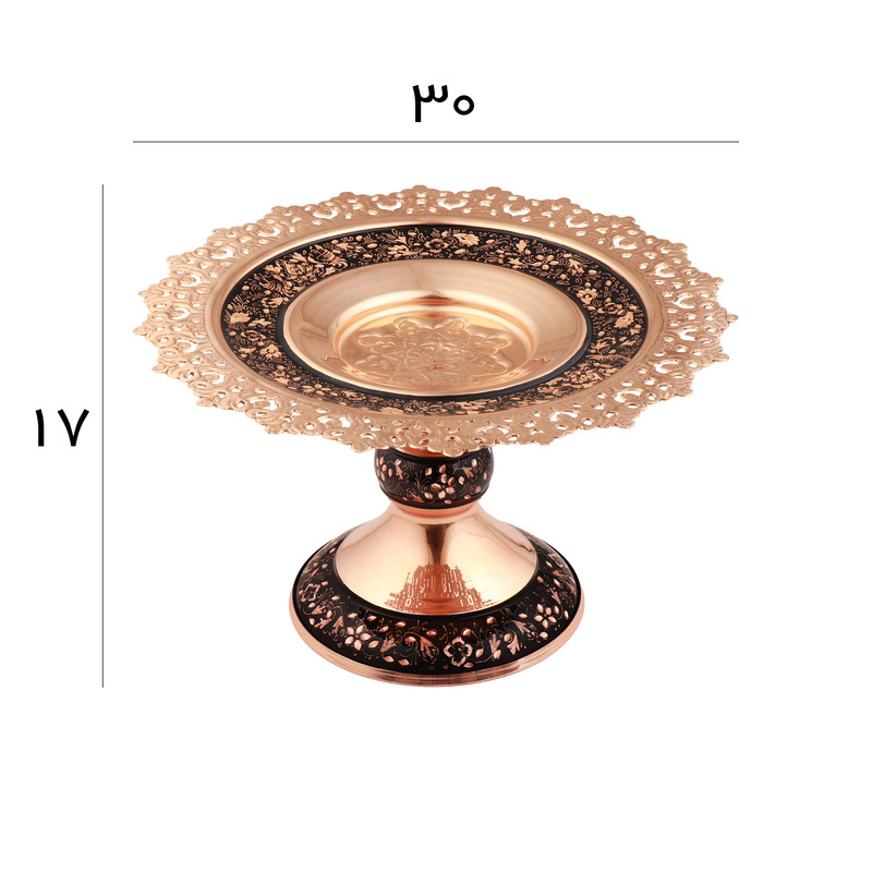 مشخصات فیزیکی: این شیرینی خوری با ارتفاع 17 سانتیمتر و قطر 30 سانتیمتر از جنس مس ساخته شده و با هنر اصیل الماستراش اصفهان مزین گردیده است. نقوش ظریف و درخشان حک شده روی بدنه به وسیله قلم های تیغ الماس، نمایی چشمگیر از هنر قلمزنی ایرانی را به نمایش میگذارد. تضاد رنگ مس براق با زمینهی تیره که جلوه ای از قدرت و ثروت دارند و همچنین خطوط درخشان، آن را به انتخابی خاص برای دکوراسیون و هدیه تبدیل کرده است. اندازهی مناسب این اثر باعث میشود بهراحتی در ویترین، میز پذیرایی یا دکور منزل جای گیرد.
