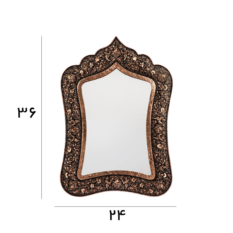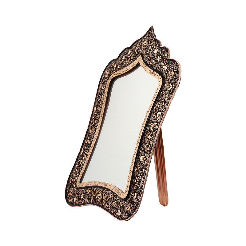مشخصات فیزیکی: این آینه دارای ابعاد 36 در 24 سانتیمتر است و از جنس مس ساخته شده و با هنر اصیل الماستراش اصفهان مزین گردیده است. نقوش ظریف و درخشان حک شده روی بدنه به وسیله قلم های تیغ الماس، نمایی چشمگیر از هنر قلمزنی ایرانی را به نمایش میگذارد. تضاد رنگ مس براق با زمینهی تیره که جلوه ای از قدرت و ثروت دارند و همچنین خطوط درخشان، آن را به انتخابی خاص برای دکوراسیون و هدیه تبدیل کرده است. اندازهی مناسب این اثر باعث میشود بهراحتی در ویترین، میز پذیرایی یا دکور منزل جای گیرد.