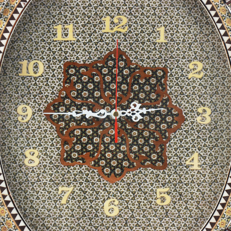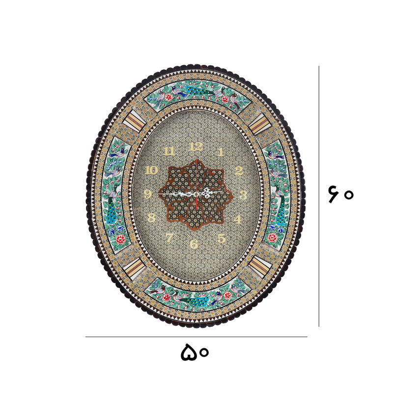 مشخصات فیزیکی: این ساعت هنری با قاب بیضیشکل به ابعاد کلی ۶۰×۵۰ سانتیمتر طراحی شده است. صفحه داخلی ساعت دارای ابعاد ۲۴×۳۰ سانتیمتر بوده و با هنر ظریف خاتمکاری آراسته شده است. قاب اطراف نیز با نقاشی گل و مرغ سنتی ایرانی مزین گردیده و زیبایی چشمگیری به اثر بخشیده است.