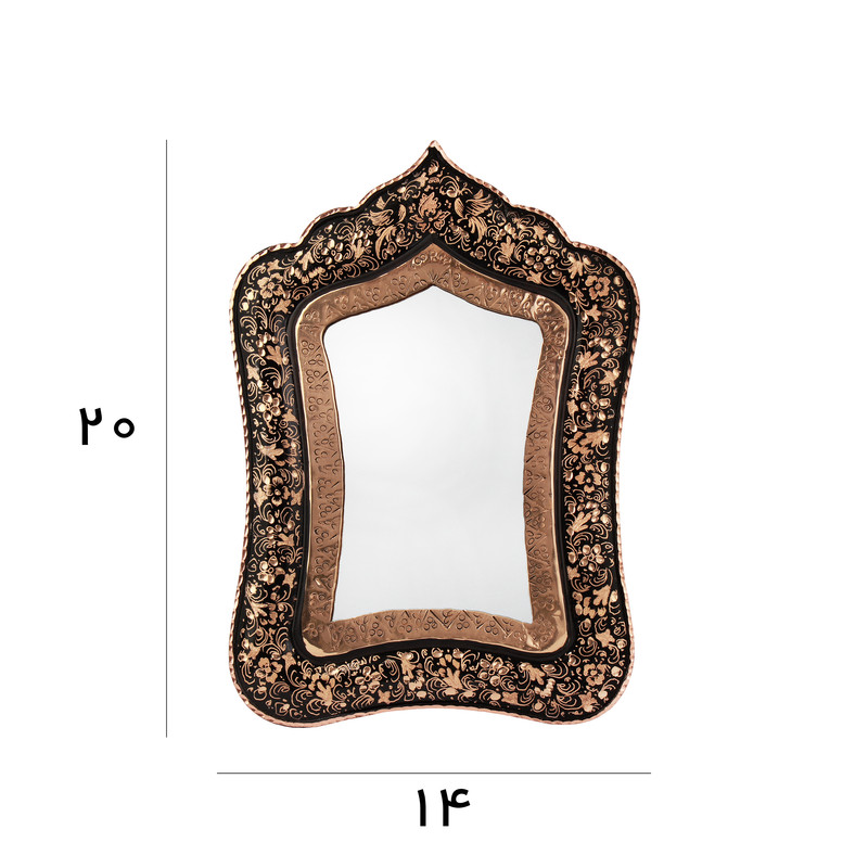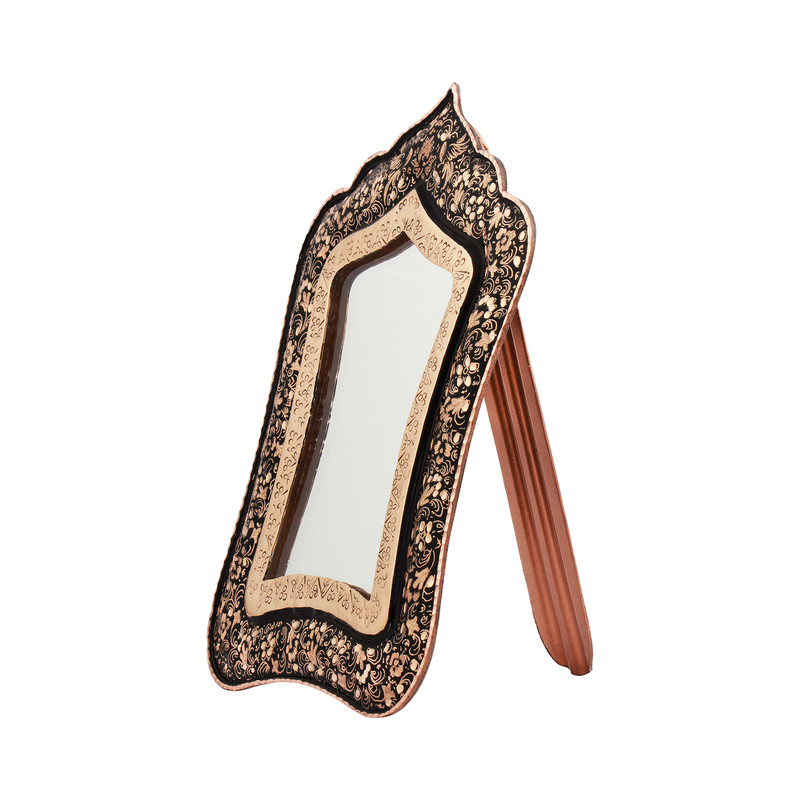 مشخصات فیزیکی: این آینه دارای ابعاد 20 در 14 سانتیمتر است و از جنس مس ساخته شده و با هنر اصیل الماستراش اصفهان مزین گردیده است. نقوش ظریف و درخشان حک شده روی بدنه به وسیله قلم های تیغ الماس، نمایی چشمگیر از هنر قلمزنی ایرانی را به نمایش میگذارد. تضاد رنگ مس براق با زمینهی تیره که جلوه ای از قدرت و ثروت دارند و همچنین خطوط درخشان، آن را به انتخابی خاص برای دکوراسیون و هدیه تبدیل کرده است. اندازهی مناسب این اثر باعث میشود بهراحتی در ویترین، میز پذیرایی یا دکور منزل جای گیرد.
