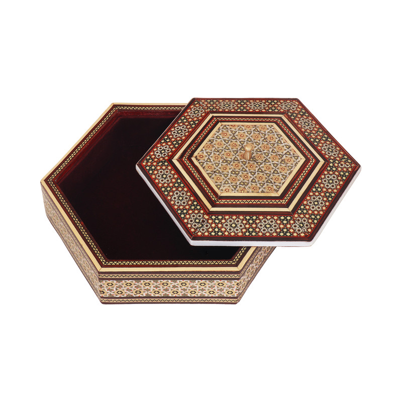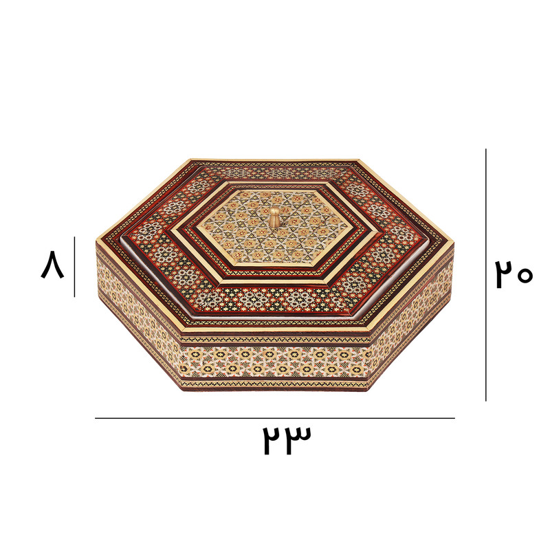 این شکلاتخوری در فرم خاص ششضلعی طراحی شده که در اصطلاح هنری، با عنوان «شکلاتخوری شیرازی» شناخته میشود. ساختار آن از چوب مقاوم کبوده است و در طراحی بیرونی آن، از ترکیب هماهنگ چند طرح مختلف خاتم بهره گرفته شده است. درب با فرم ششضلعی متناسب، دارای دستگیرهی برنجی است و داخل کار با لایهای از پارچهی جیر مرغوب پوشیده شده و روی آن یک صفحهی شیشهای قرار گرفته که هم محافظ داخلی است و هم نمایی شفاف و درخشان ایجاد میکند