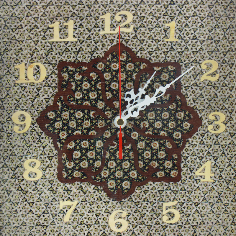 نوع هنر: این ساعت ترکیبی از هنر خاتمکاری و نقاشی سنتی گل و مرغ است. نقشهای هندسی خاتم در صفحه مرکزی با ظرافت اجرا شده و قاب اطراف با نقاشی گل و مرغ، هماهنگی دلنشینی از اصالت و زیبایی ایرانی ایجاد کرده است.