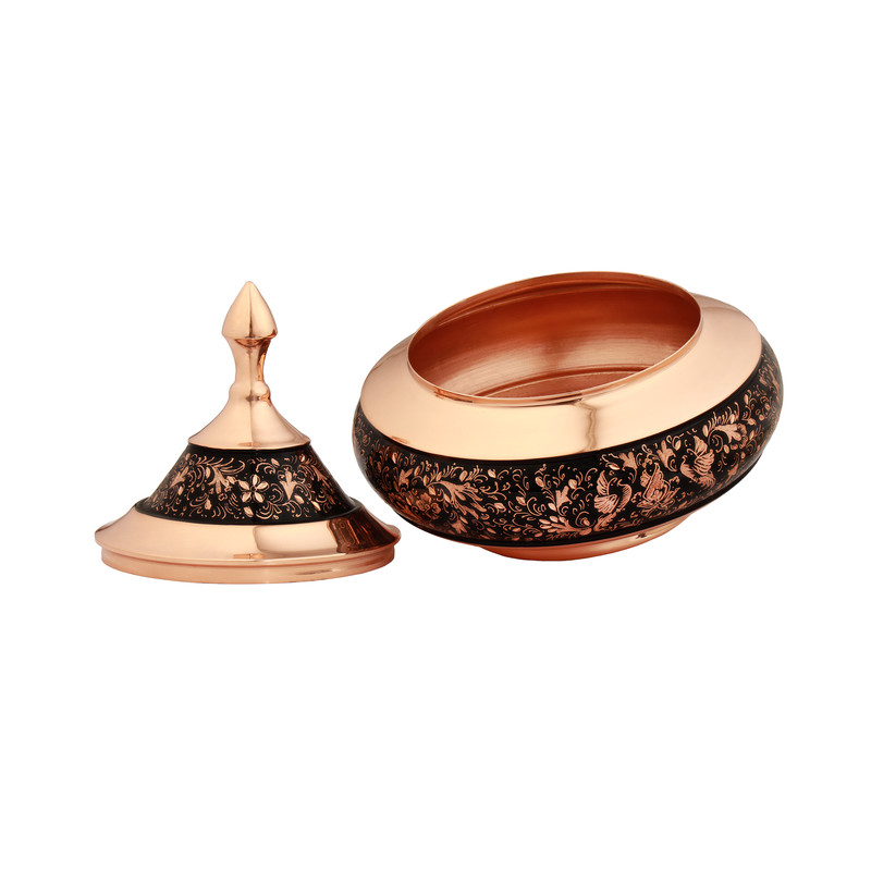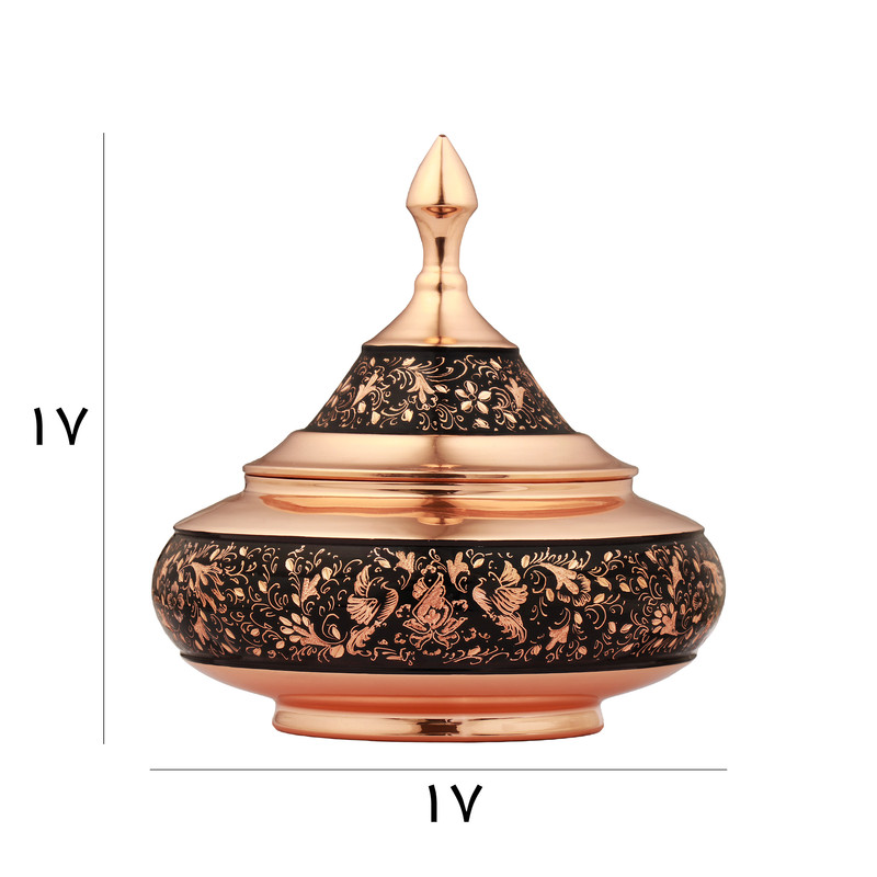 مشخصات فیزیکی: این قندان با ارتفاع 17 سانتیمتر و قطر دهانه 17 سانتیمتر از جنس مس ساخته شده و با هنر اصیل الماستراش اصفهان مزین گردیده است. نقوش ظریف و درخشان حک شده روی بدنه به وسیله قلم های تیغ الماس، نمایی چشمگیر از هنر قلمزنی ایرانی را به نمایش میگذارد. تضاد رنگ مس براق با زمینهی تیره که جلوه ای از قدرت و ثروت دارند و همچنین خطوط درخشان، آن را به انتخابی خاص برای دکوراسیون و هدیه تبدیل کرده است. اندازهی مناسب این اثر باعث میشود بهراحتی در ویترین، میز پذیرایی یا دکور منزل جای گیرد.