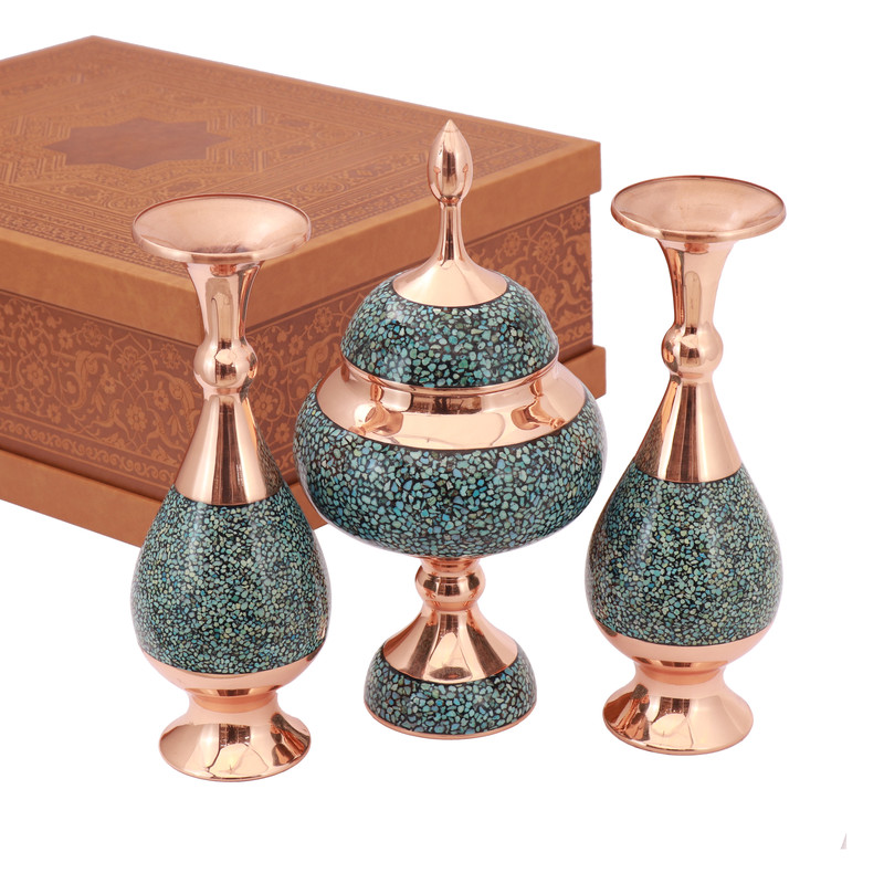 سطح ظروف این مجموعه با قطعات ریز و درخشان فیروزه طبیعی تزئین شده که در کنار زمینهی مسی، زیبایی سنتی و اصالت هنر ایرانی را بهخوبی نمایان میسازد. شکلاتخوری دربدار، علاوه بر جنبهی تزئینی، کاربردی و مناسب برای پذیرایی رسمی است. گلدانهای بلند با طراحی هماهنگ، شکوه و توازن کمنظیری به این ترکیب بخشیدهاند.