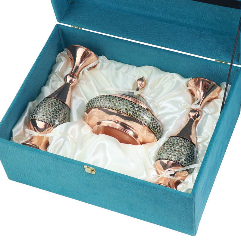 این ست شامل یک جفت گلدان مس و خاتم با ارتفاع ۳۰ سانتیمتر و یک قندان سفینهای شکل مس و خاتم در سایز ۳ است که با دقت و ظرافت در یک جعبه مخملی با ابعاد ۵۰×۴۰×۲۵ سانتیمتر قرار گرفتهاند.