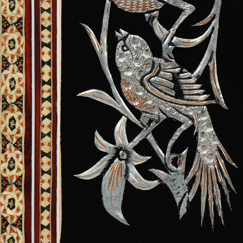 این تابلوی نفیس با ابعاد شاسی ۱۷ در ۳۲ و ابعاد صفحه ۱۰ در ۲۵ سانتیمتر، دارای ویژگی خاصی در طراحی قاب است که آن را از نمونههای ساده متمایز میکند. اصطلاح «دو قاب» به سبک ساخت پروفیل چوبی آن اشاره دارد؛ به این معنی که قاب دارای تراشها و پلههایی است که به آن عـمق و بُعد بیشتری بخشیده و حالتی شبیه به دو قابِ تودرتو ایجاد کرده است. در مرکز این اثر، پلاکی از جنس مس قرار دارد که با لعاب قلع سفیدکاری شده و زمینه آن برای برجستگی بیشتر نقوش، تیره (سیاهقلم) شده است. وجود شیشه روی کل کار، محافظی مطمئن برای ظرافتهای خاتم و پلاک فلزی است. شرایط نگهداری