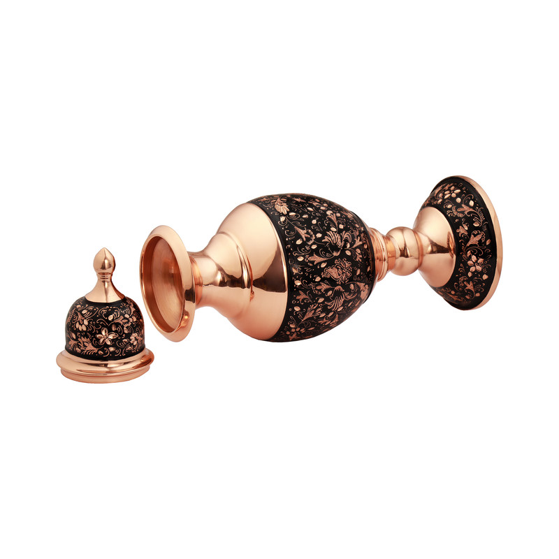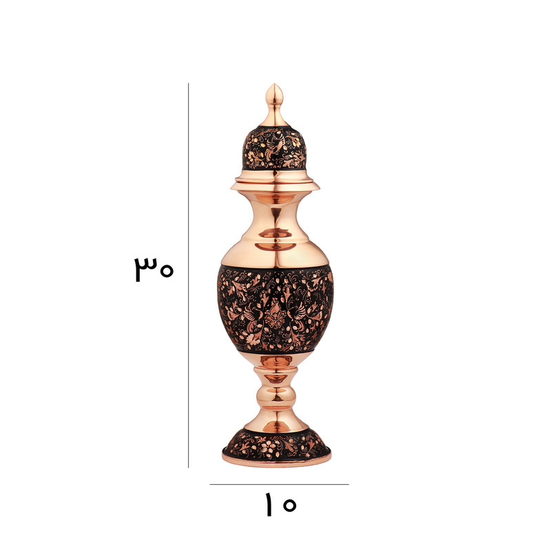 مشخصات فیزیکی: این سنبلدان با ارتفاع 30 سانتیمتر و قطر دهانه 10 سانتیمتر از جنس مس ساخته شده و با هنر اصیل الماستراش اصفهان مزین گردیده است. نقوش ظریف و درخشان حک شده روی بدنه به وسیله قلم های تیغ الماس، نمایی چشمگیر از هنر قلمزنی ایرانی را به نمایش میگذارد. تضاد رنگ مس براق با زمینهی تیره که جلوه ای از قدرت و ثروت دارند و همچنین خطوط درخشان، آن را به انتخابی خاص برای دکوراسیون و هدیه تبدیل کرده است. اندازهی مناسب این اثر باعث میشود بهراحتی در ویترین، میز پذیرایی یا دکور منزل جای گیرد.