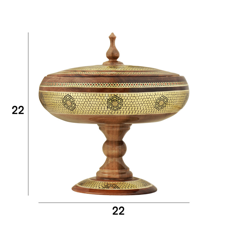 این شکلاتخوری زیبا با ارتفاع ۲۲ سانتیمتر، اثری متفاوت و متمایز از محصولات تمام فلزی است. بدنه اصلی ظرف از چوب گردوی مرغوب و یکتکه ساخته شده که با هنر خراطی به فرمی کلاسیک و پایهدار درآمده است. برخلاف ظروف مسی، این محصول حس گرم و طبیعی چوب را به دکوراسیون منتقل میکند. بر روی بدنه و پایه چوبی، نوارهایی از خاتم «طلایی» کار شده است. این خاتم به دلیل استفاده زیاد از فلز برنج، درخششی زرد و طلایی دارد که در کنار رنگ قهوه ای و بافت طبیعی چوب، ترکیبی فوقالعاده شیک و سنگین ایجاد کرده است. سطح کار با پلیاستر پوشش داده شده تا علاوه بر براقیت، از چوب و خاتم محافظت شود. شرایط نگهداری
