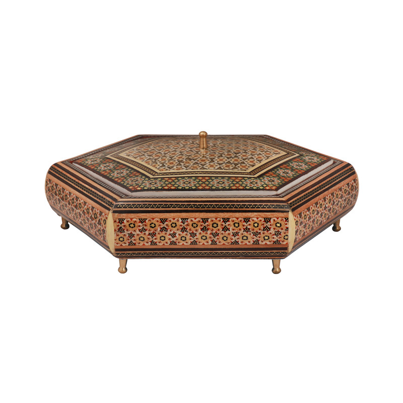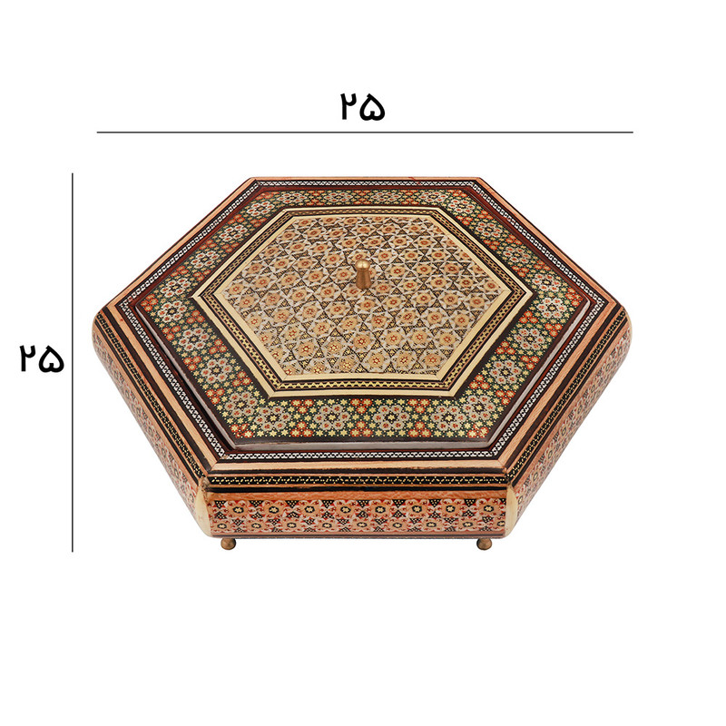 مشخصات فیزیکی: شکلات خوری پایه برنجی ۶ گوش، یک ظرف هنری و سنتی است که با ترکیب چوب و هنر ظریف خاتمکاری زینت یافته است. جنس زیرکار شکلات خوری از چوب مرغوب بوده که سطح آن با نقشهای زیبا و ماندگار خاتم معمولی پوشیده شده است. طرح خاتم که روی محصول کار شده، جلوهای از هنر دست استادکاران ایرانی و اصالت صنایعدستی کشورمان را به نمایش میگذارد. پایههای برنجی این شکلات خوری، علاوه بر استحکام، زیبایی خاصی به این محصول بخشیده است.این شکلات خوری، مناسب استفاده در مجالس و پذیراییهای رسمی، هدیهای لوکس برای عزیزان و گزینهای بینظیر برای تکمیل دکوراسیون منزل یا محل کار شماست.