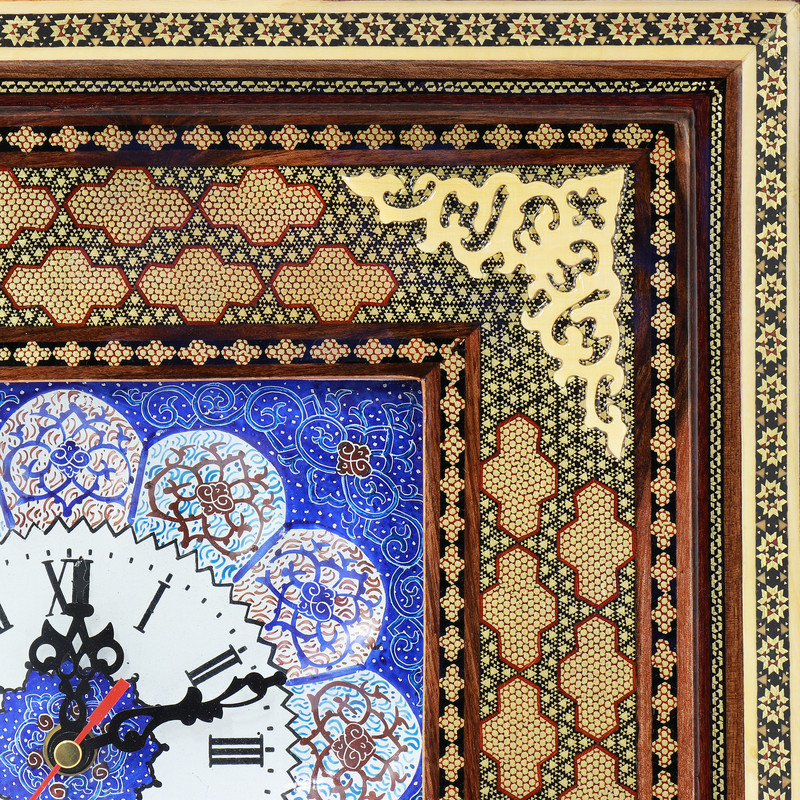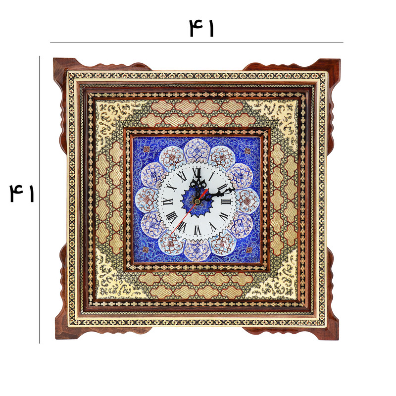 مشخصات فیزیکی: ابعاد کلی این ساعت دیواری زیبا ۴۱ در ۴۱ سانتیمتر است. قاب چوبی با تزئینات خاتمکاری منظم، صفحهای مربعی از جنس مس و میناکاری را در خود جای داده که قطر آن حدود ۲۰ سانتیمتر است. نقوش اسلیمی با لعاب آبی درخشان، جلوهای خاص به اثر بخشیدهاند.