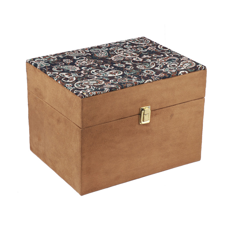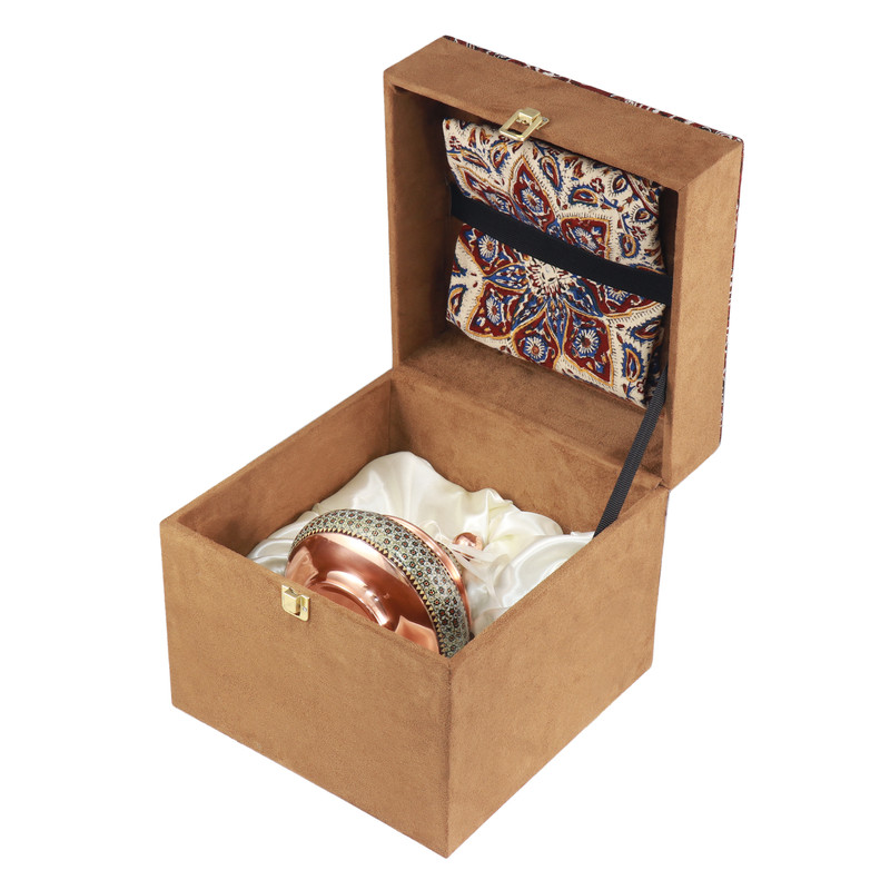 اقلام این ست درون جعبهای مخملی با روکشی از ترمه و در ابعاد ۳۰×۲۵×۲۰ سانتیمتر قرار گرفتهاند. طراحی ظریف جعبه و استفاده از فوم محافظ، علاوه بر زیبایی بصری، ایمنی در حمل و نگهداری را نیز فراهم میآورد.